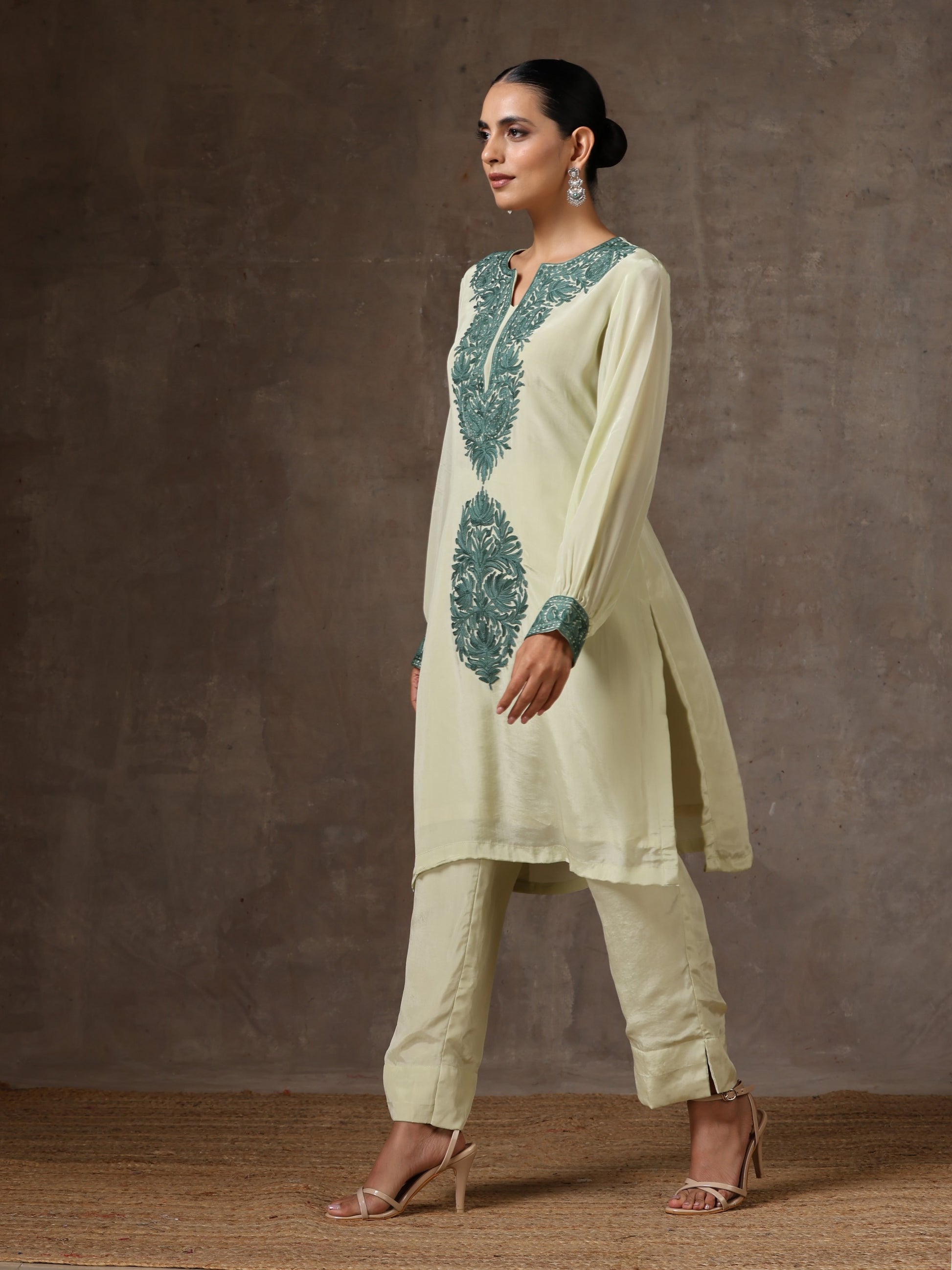 This pastel-olive colored kurta set consists of a round-neck cuff-sleeve long kurta designed with "Kashmiri Aari" embroidery, paired with straight-fit pants.