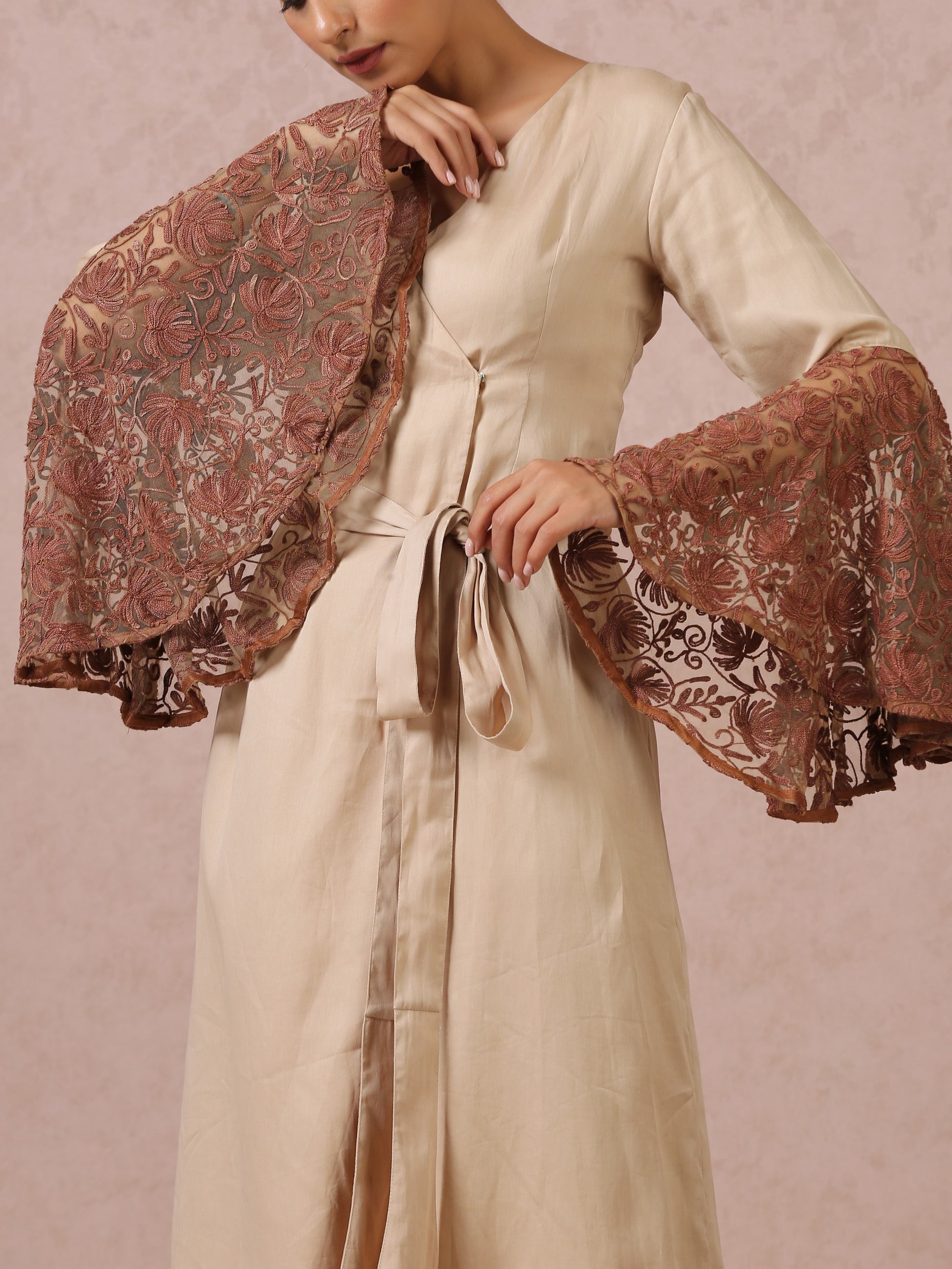 Featuring a beige color dress with "Kashmiri Aari" embroidery on specially designed bell sleeves and a self-made belt is attached to enhance the styling.
