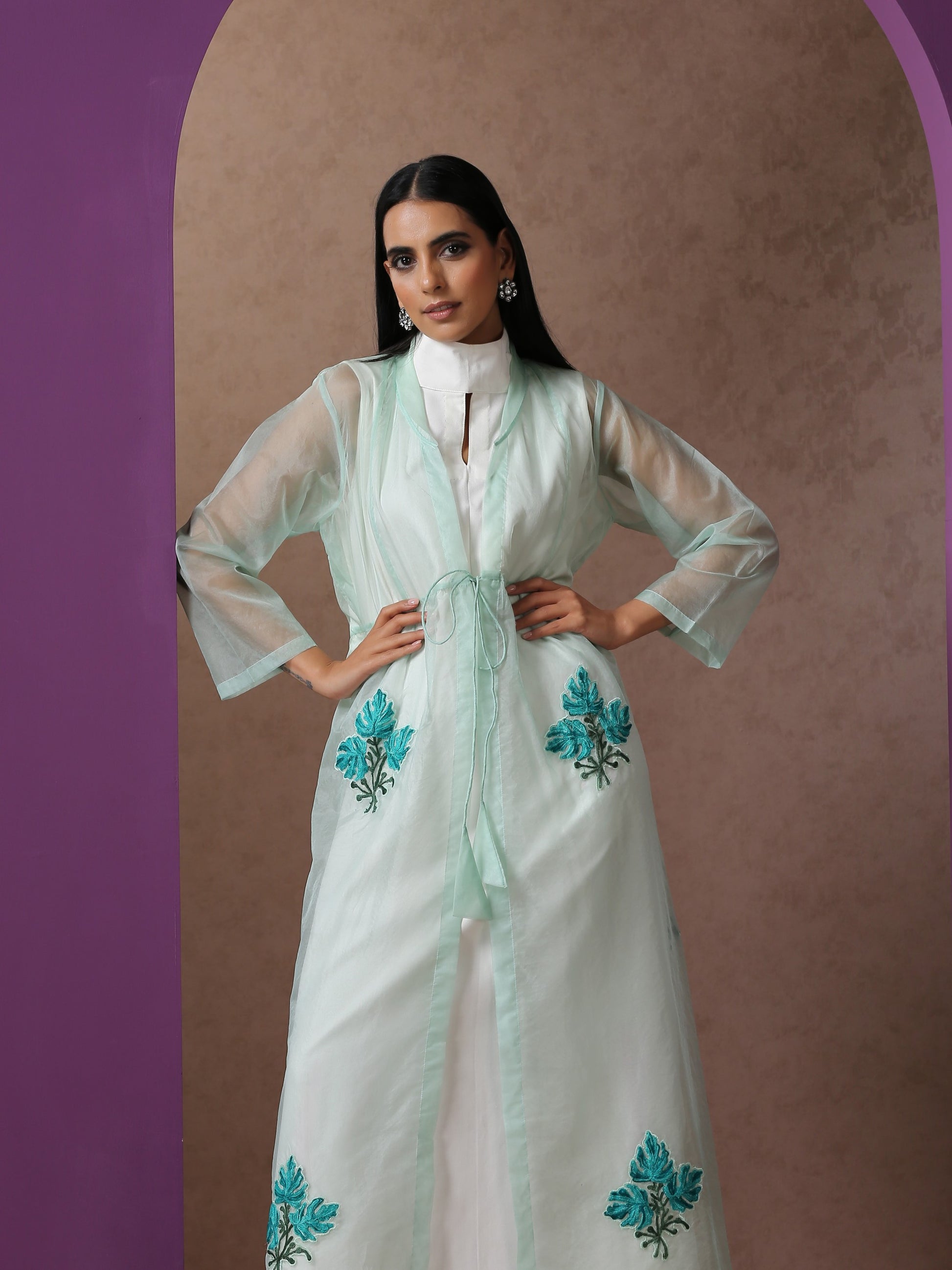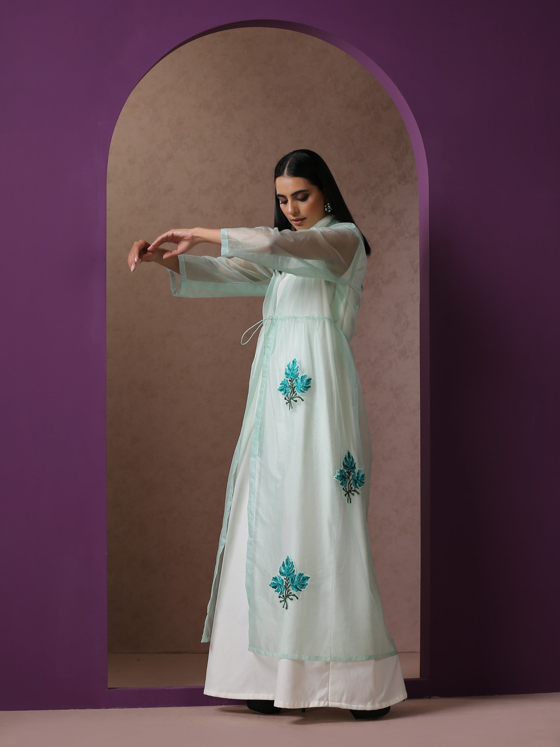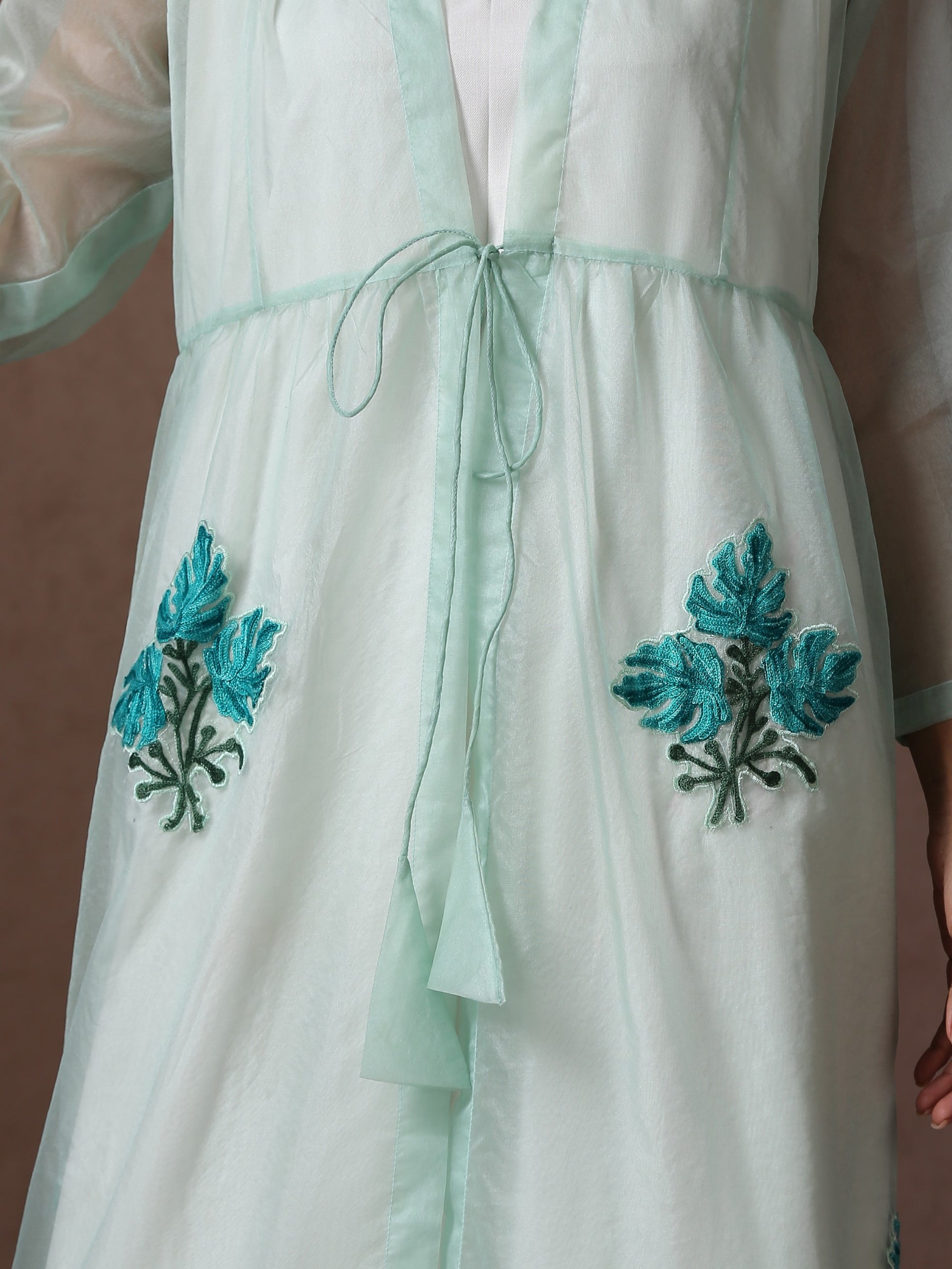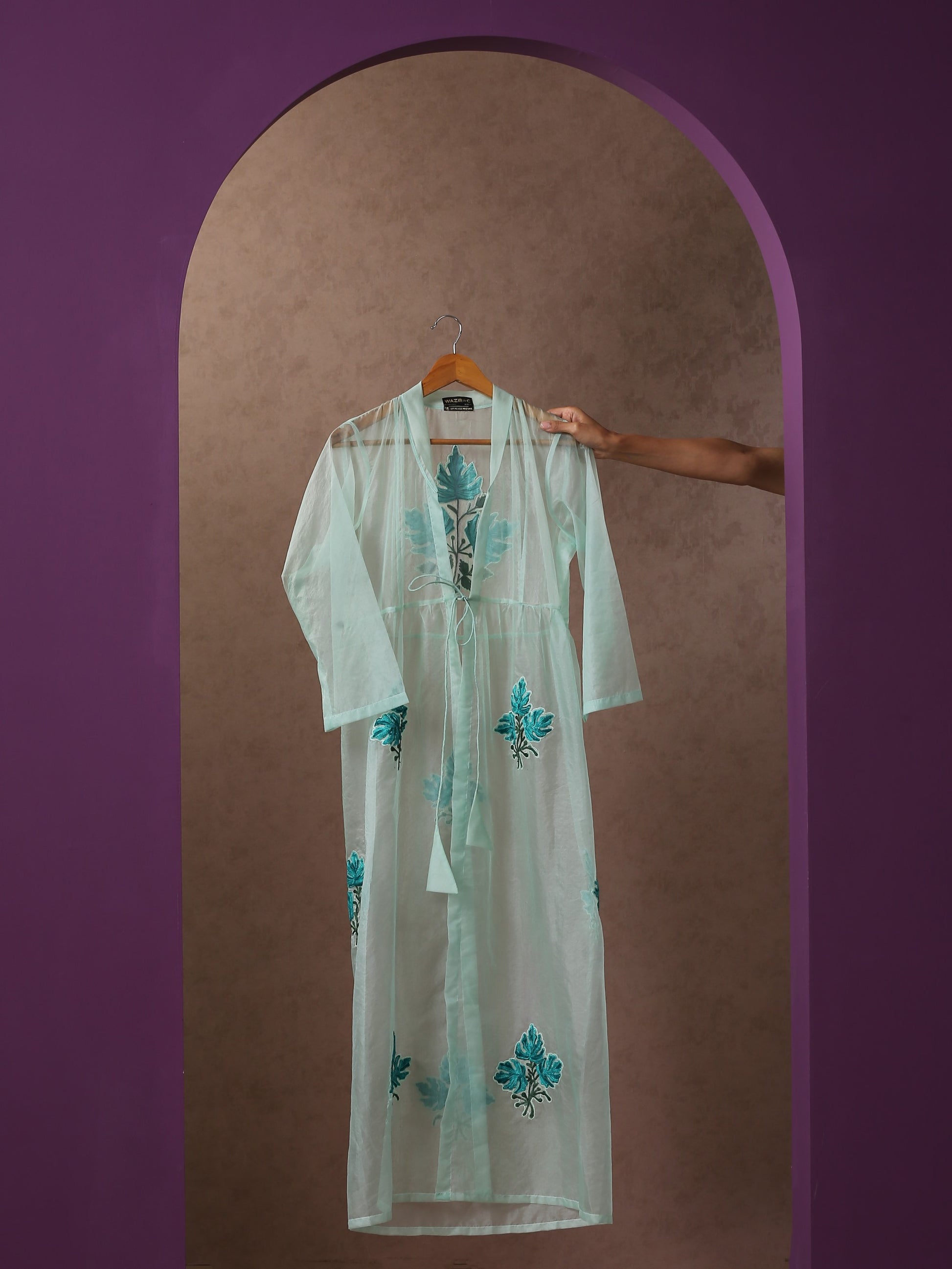Featuring a blue-colored long sleeve organza cape with a rope tie designed with dark blue "Kashmiri Aari" embroidery.