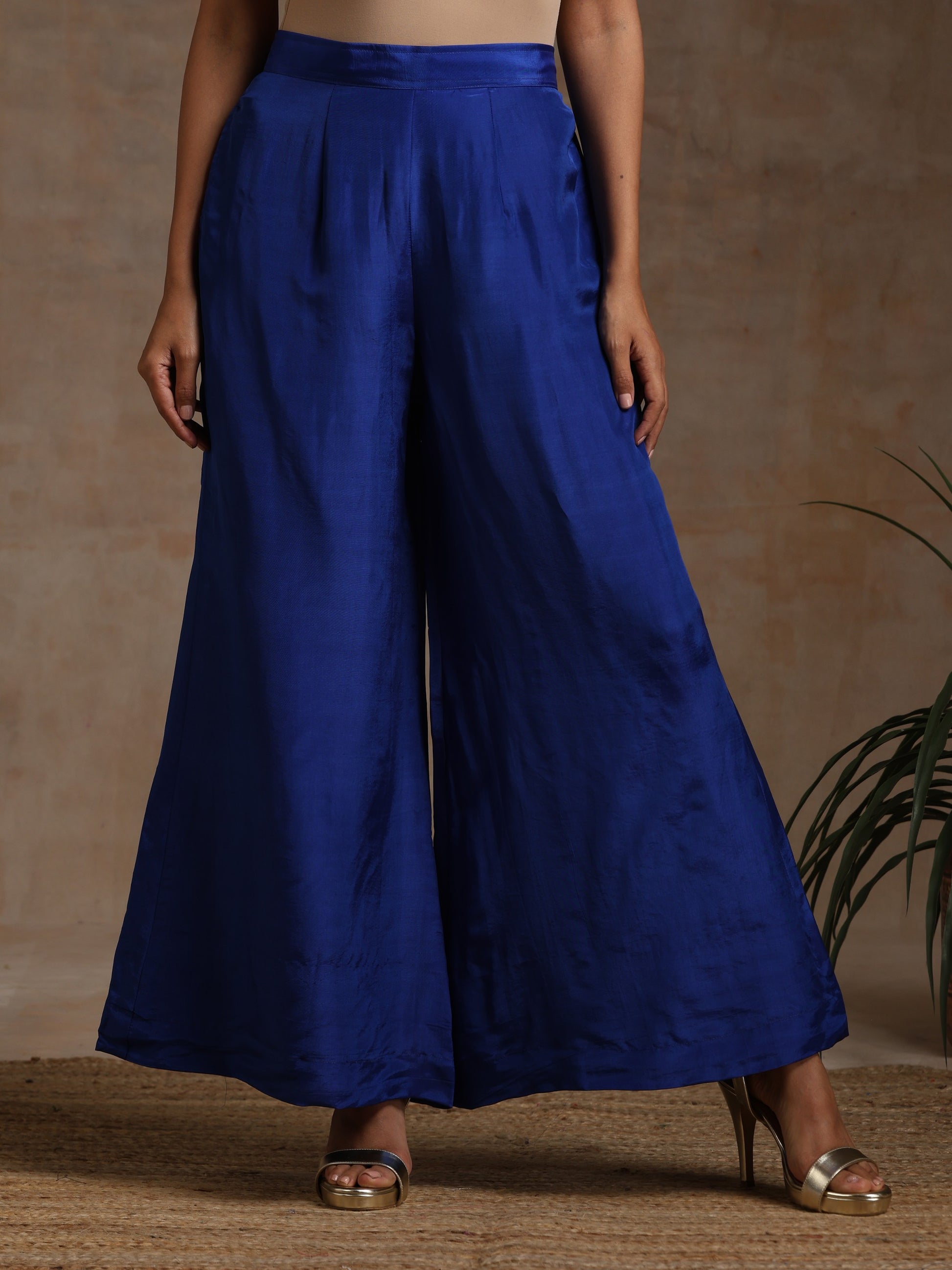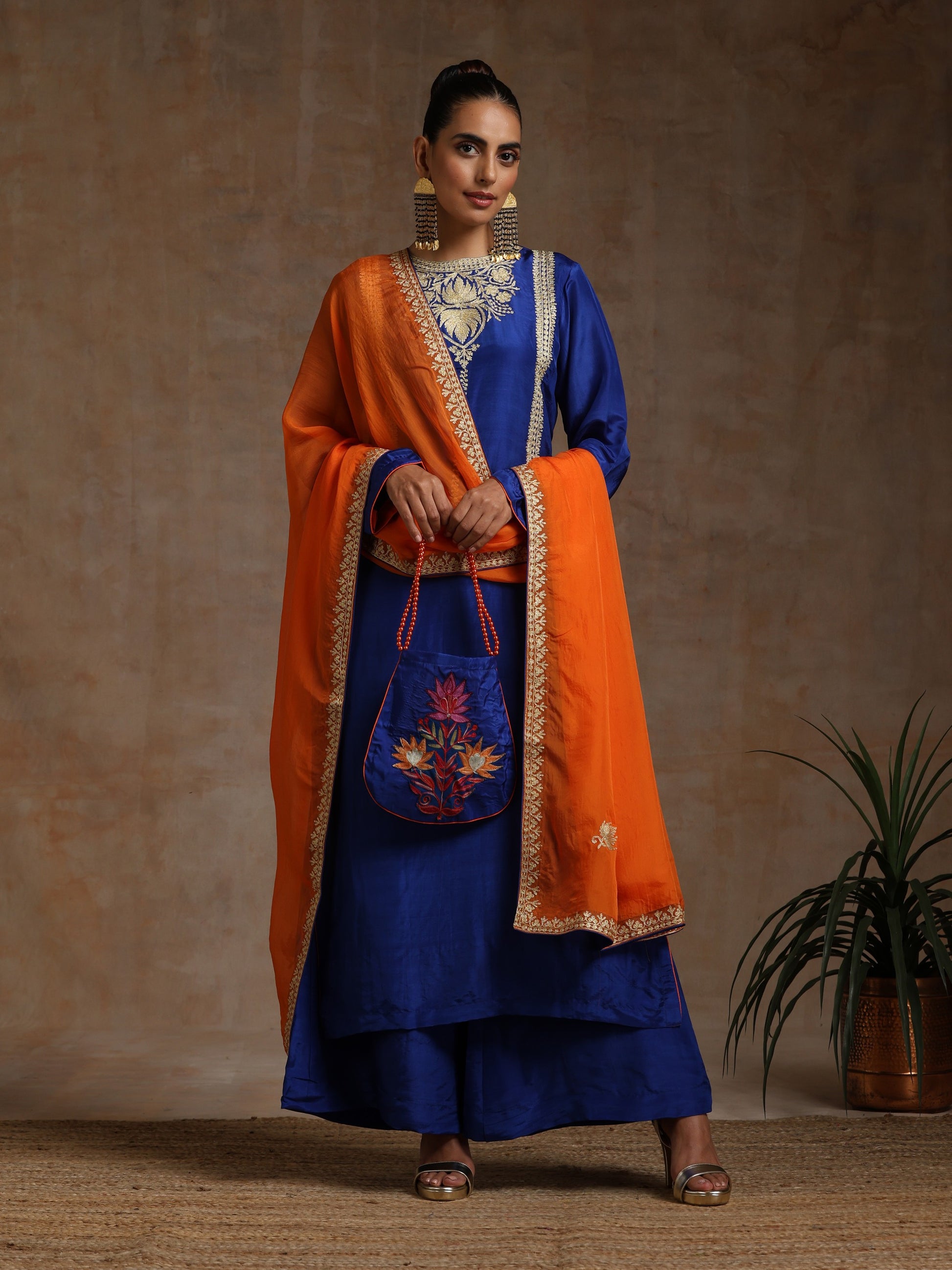 The Bandhan Royal Blue with Orange Dupatta Suit Set brings classic style to any wardrobe. Crafted from 100% Silk, this set includes a kurta with matching flared pants as well as an orange dupatta with a beautiful, embroidered border. Perfect for any occasion, wear it with gold jewelry for a truly timeless look.