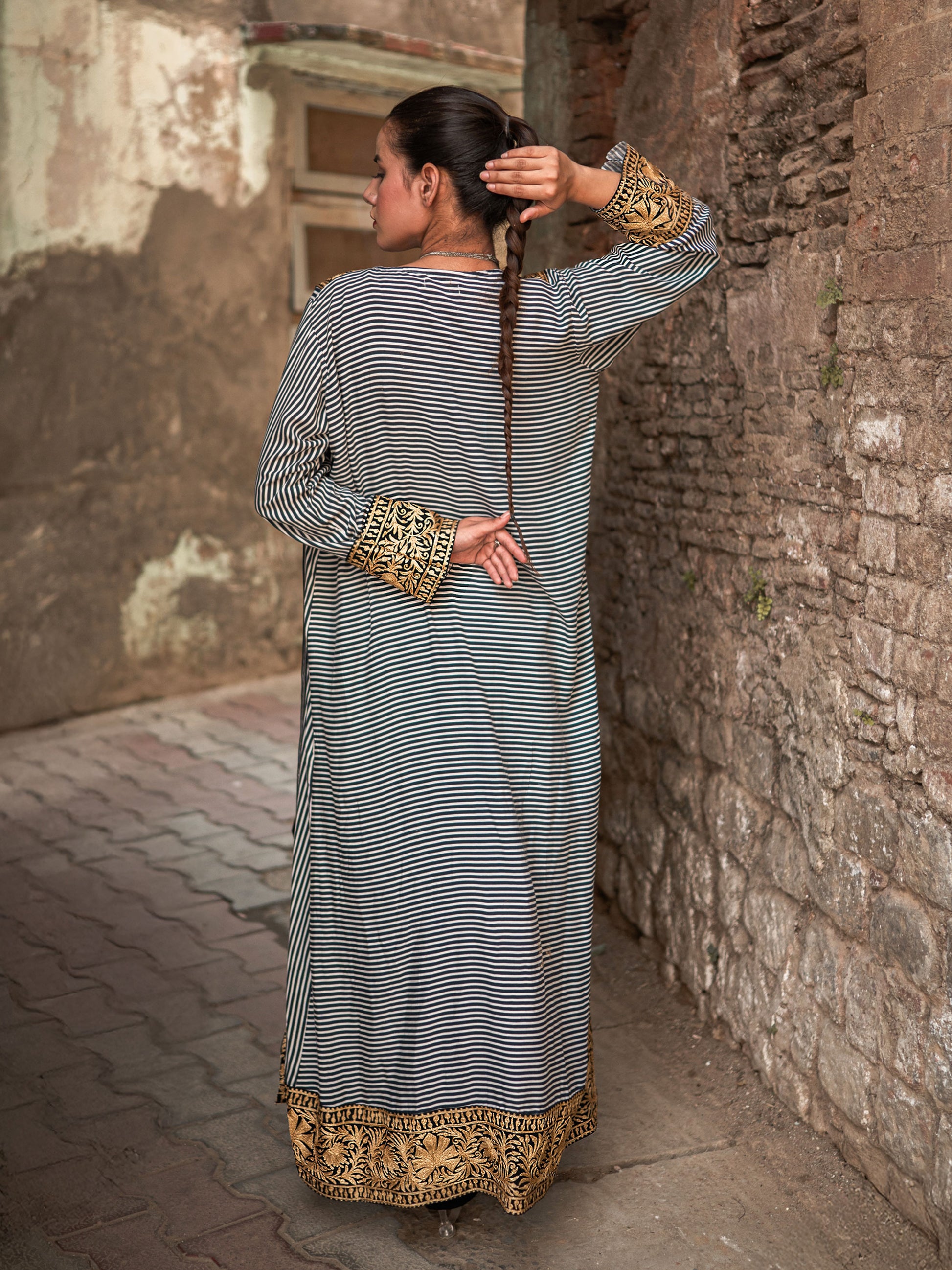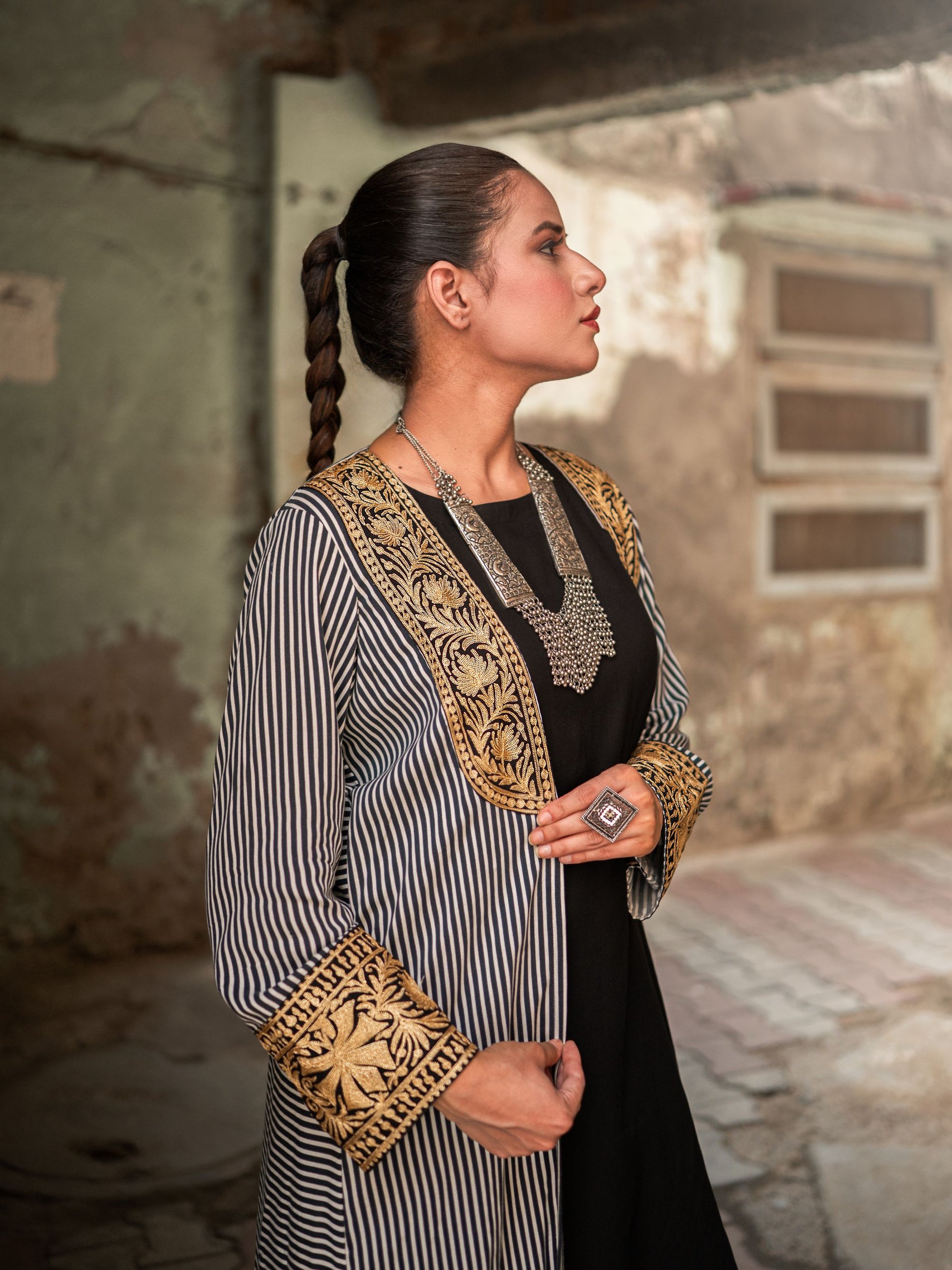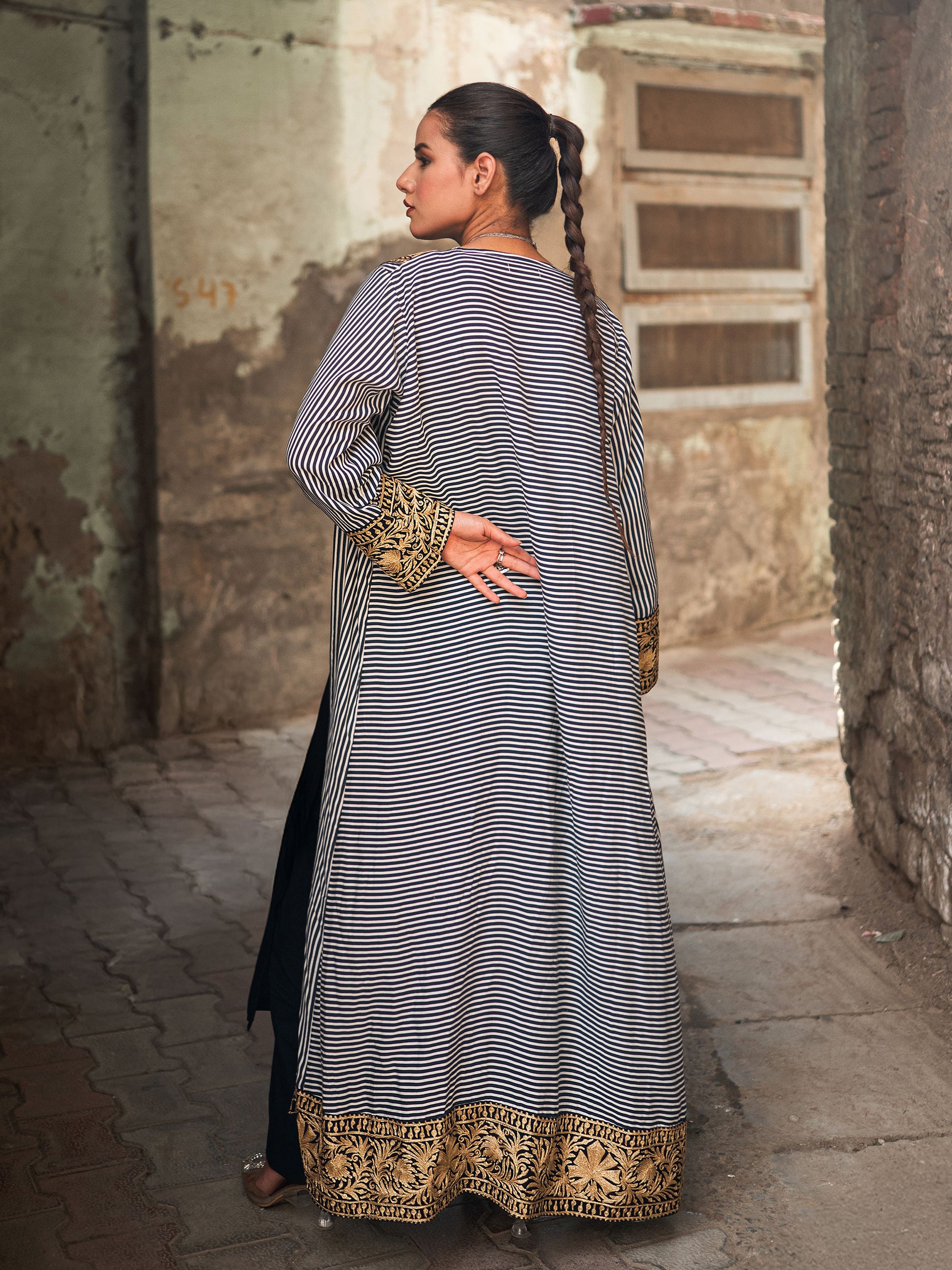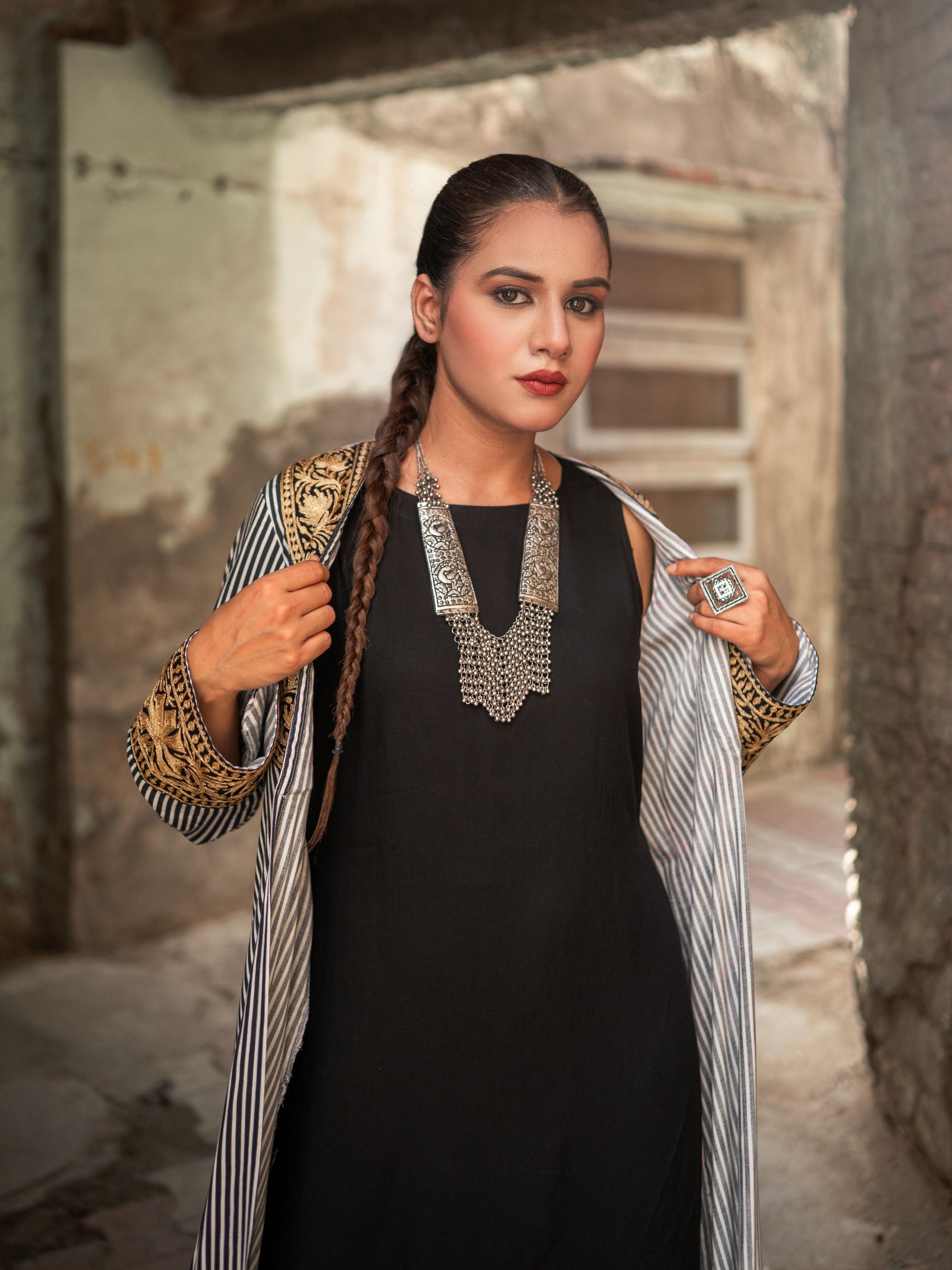Elevate your style with the Ghazal black striped cape set, featuring a black cotton kurta adorned with exquisite "Kashmiri Golden Tilla" embroidery. The matching black cotton straight pants offer a comfortable, sleek fit, while the dramatic black and white striped cape adds a touch of bold sophistication. Perfect for making a statement at any occasion.