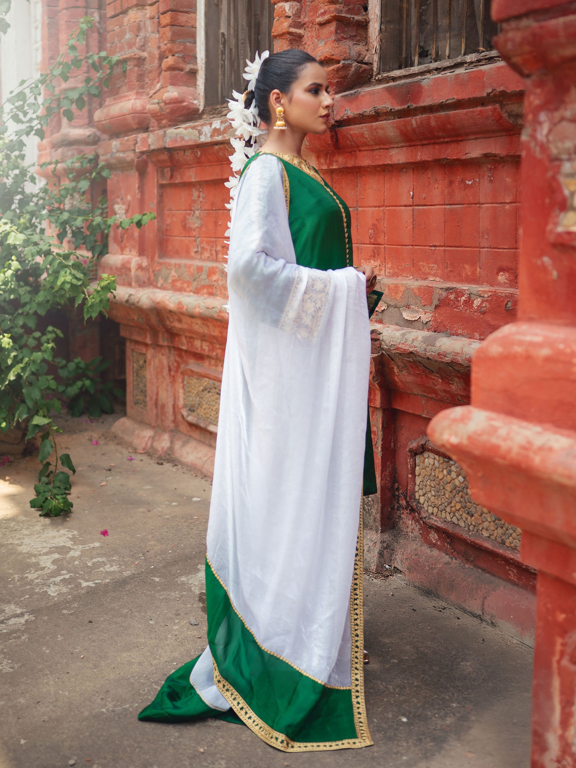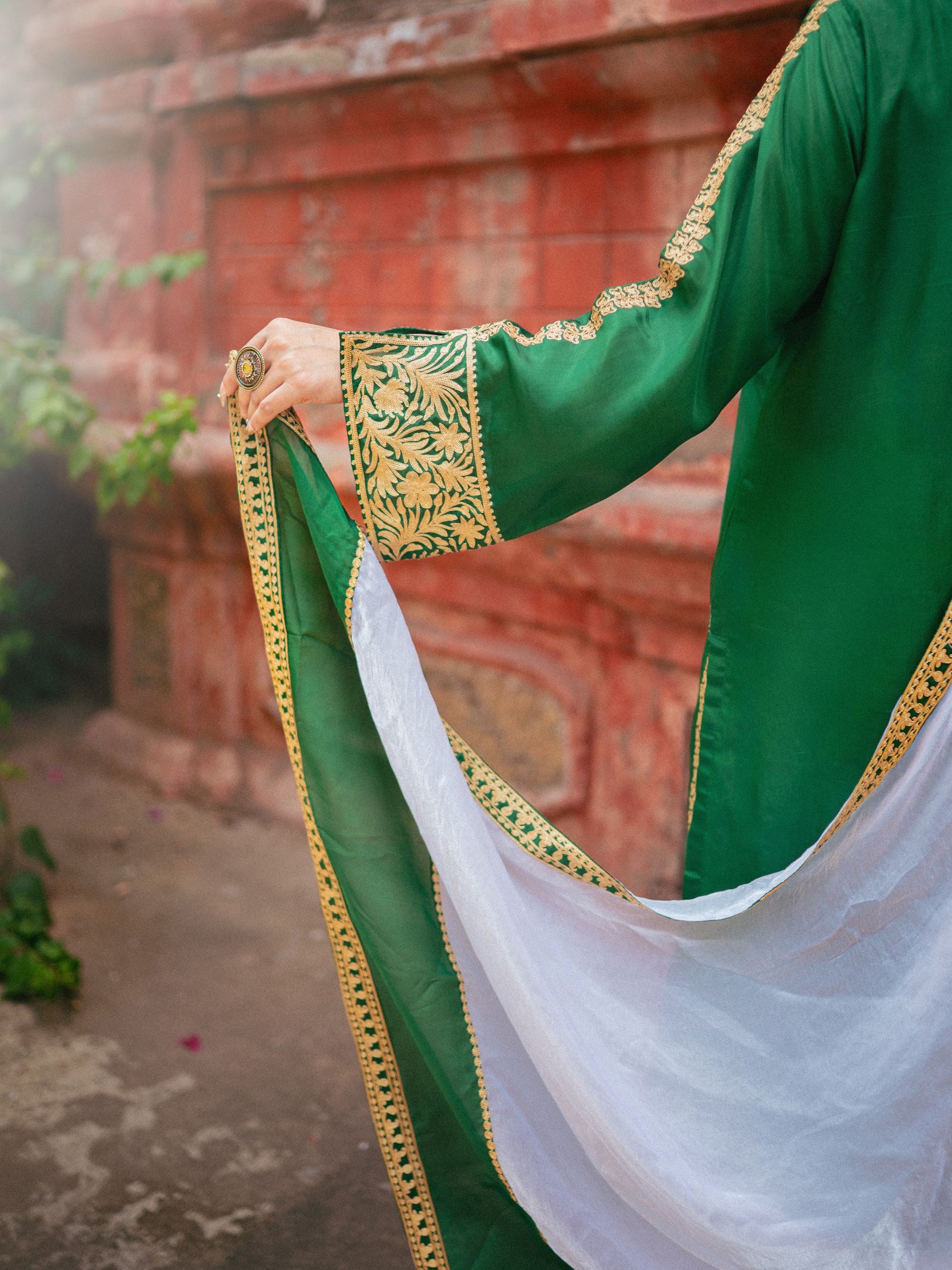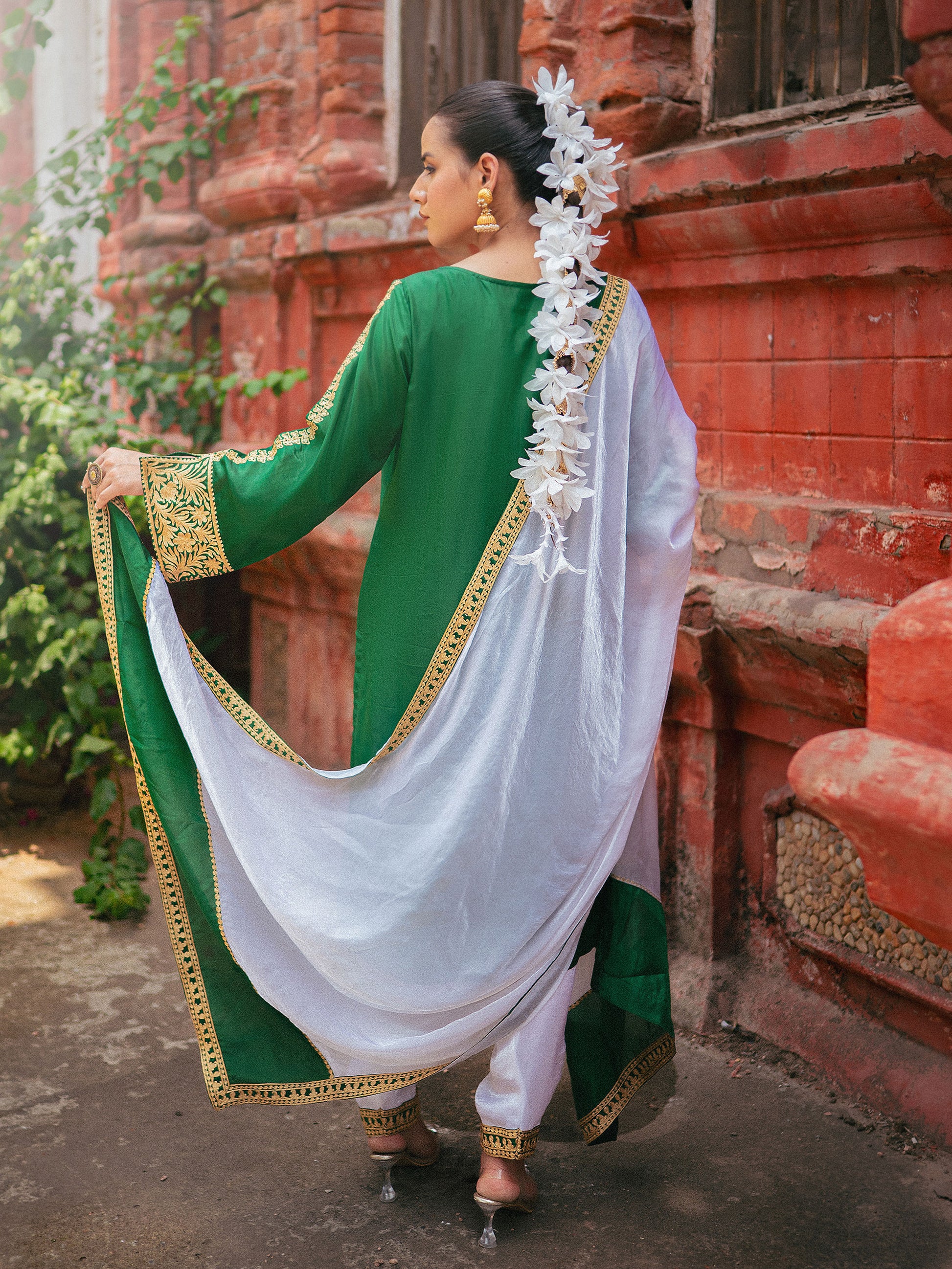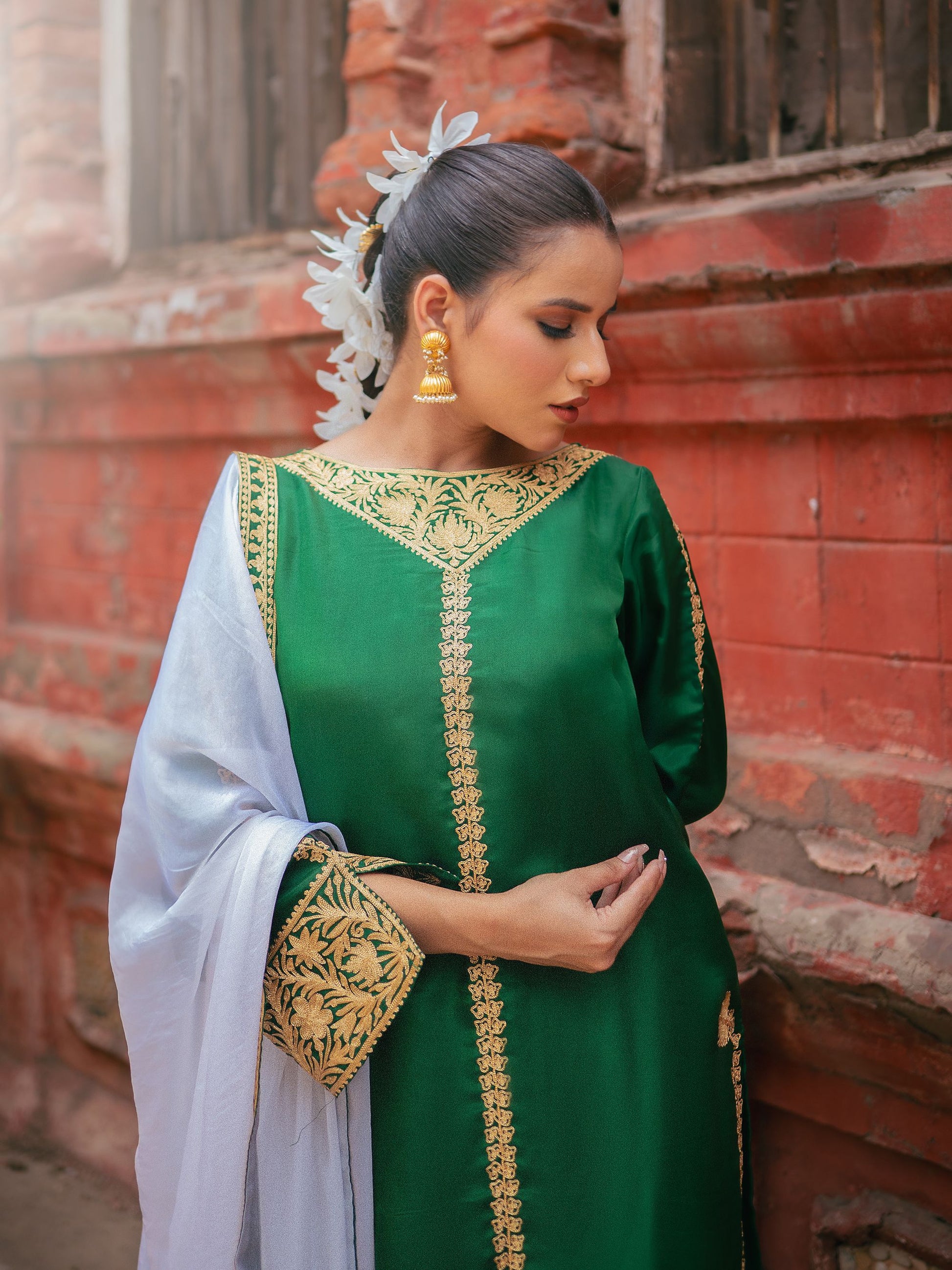 The Ghazal green and white suit set features a beautiful green silk kurta embellished with intricate "Kashmiri Golden Tilla" embroidery, imparting a sense of regal elegance. It is complemented by a white silk straight salwar and a matching white silk dupatta, making it ideal for special occasions.