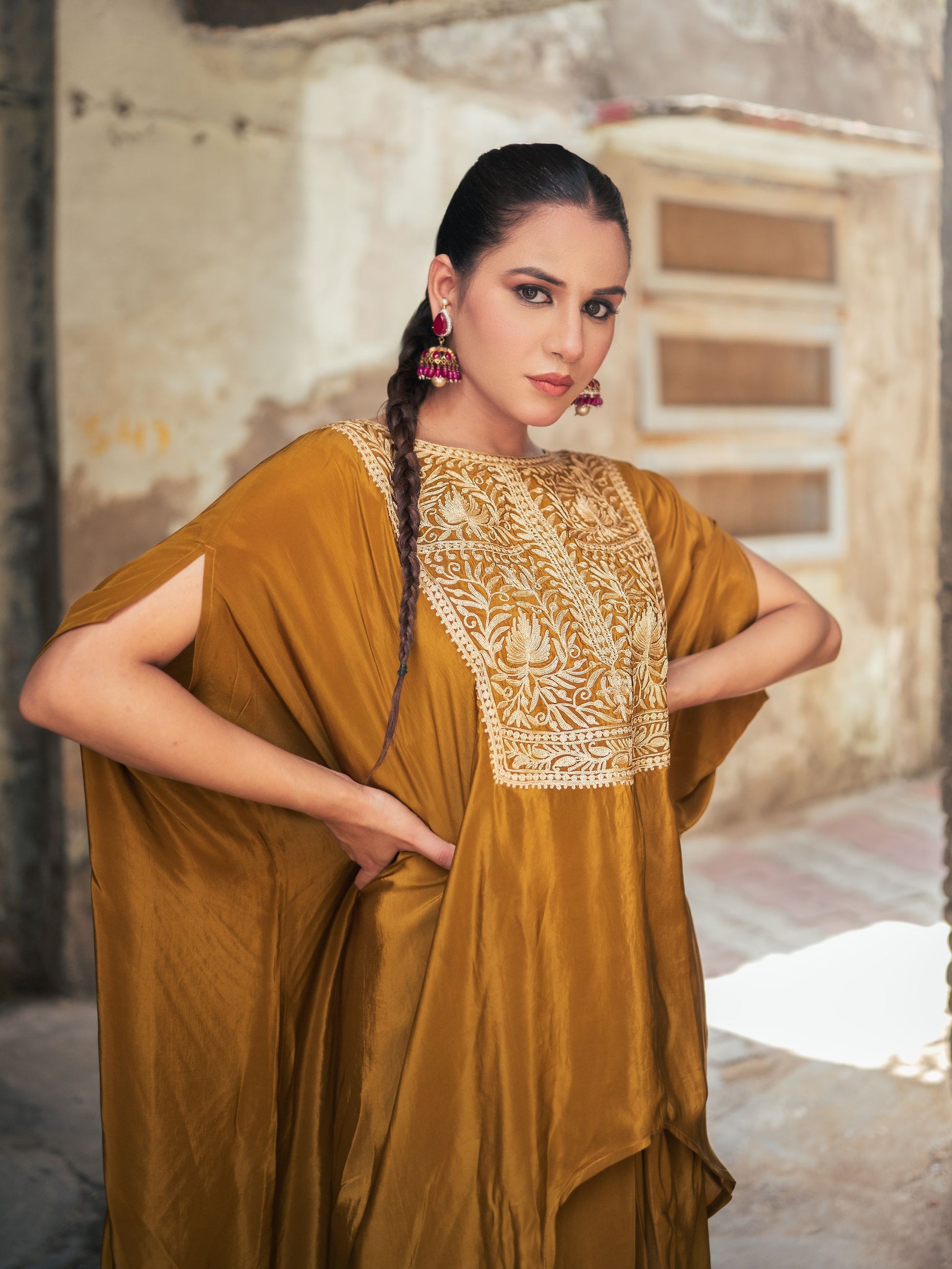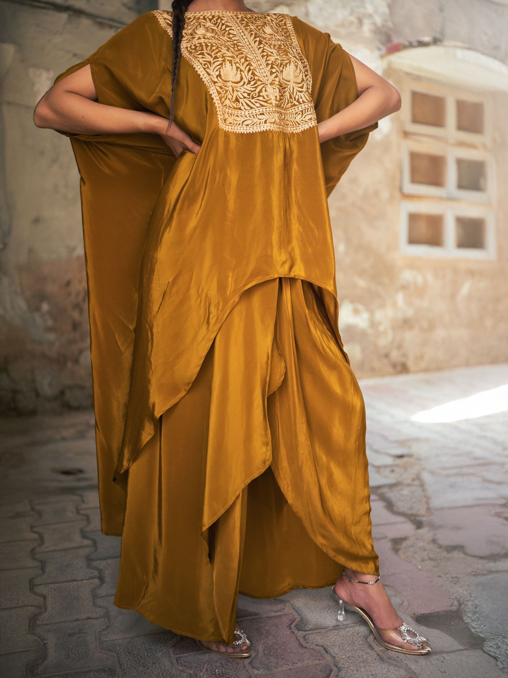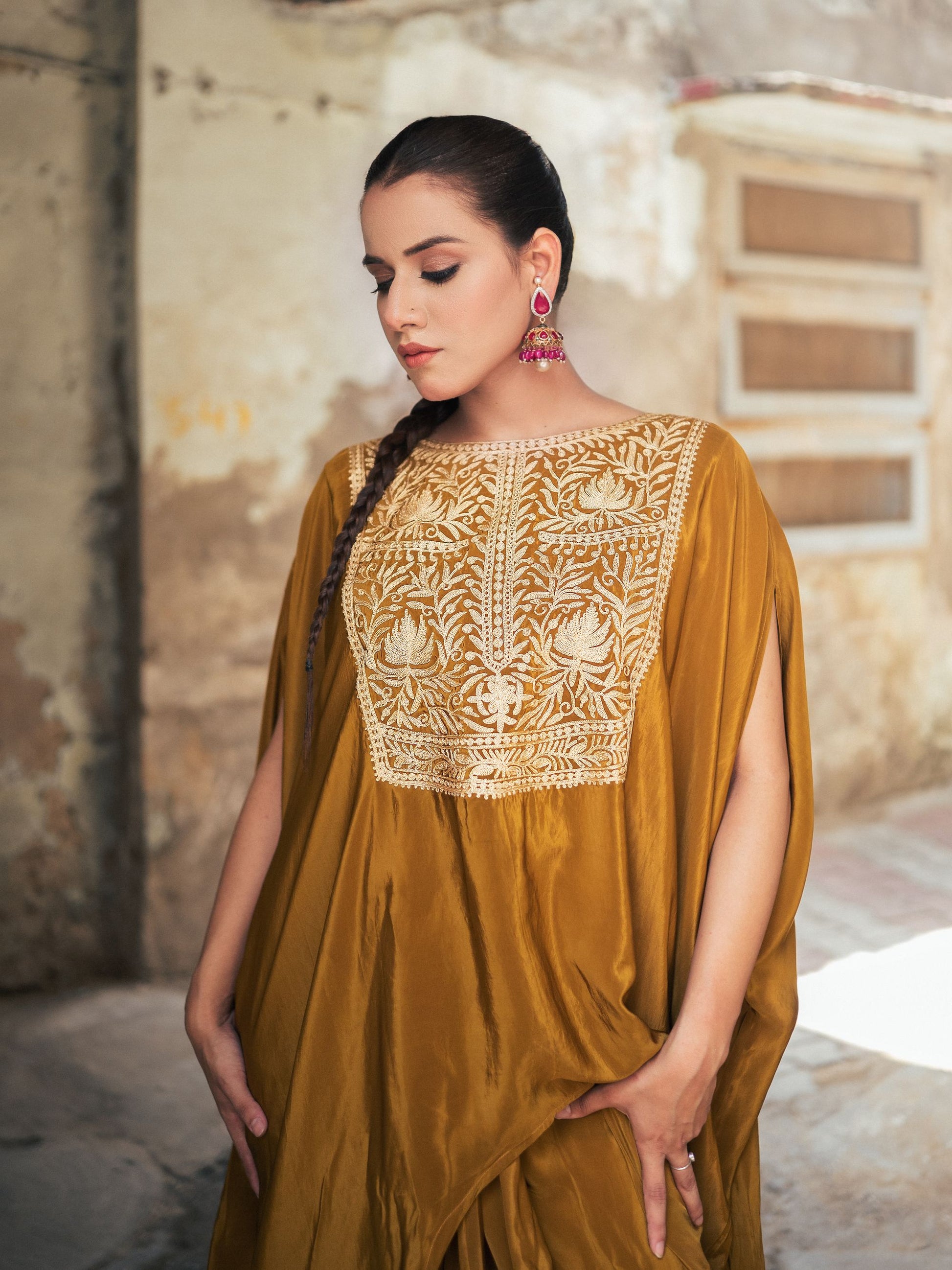 The Ghazal mustard kaftan set is adorned with intricate "Kashmiri Golden Tilla" embroidery, reflecting timeless elegance. It comes with a crepe fabric kaftan and is complemented by a matching dhoti. This set offers a perfect blend of traditional artistry and modern comfort, ideal for making a striking impression at any celebration.