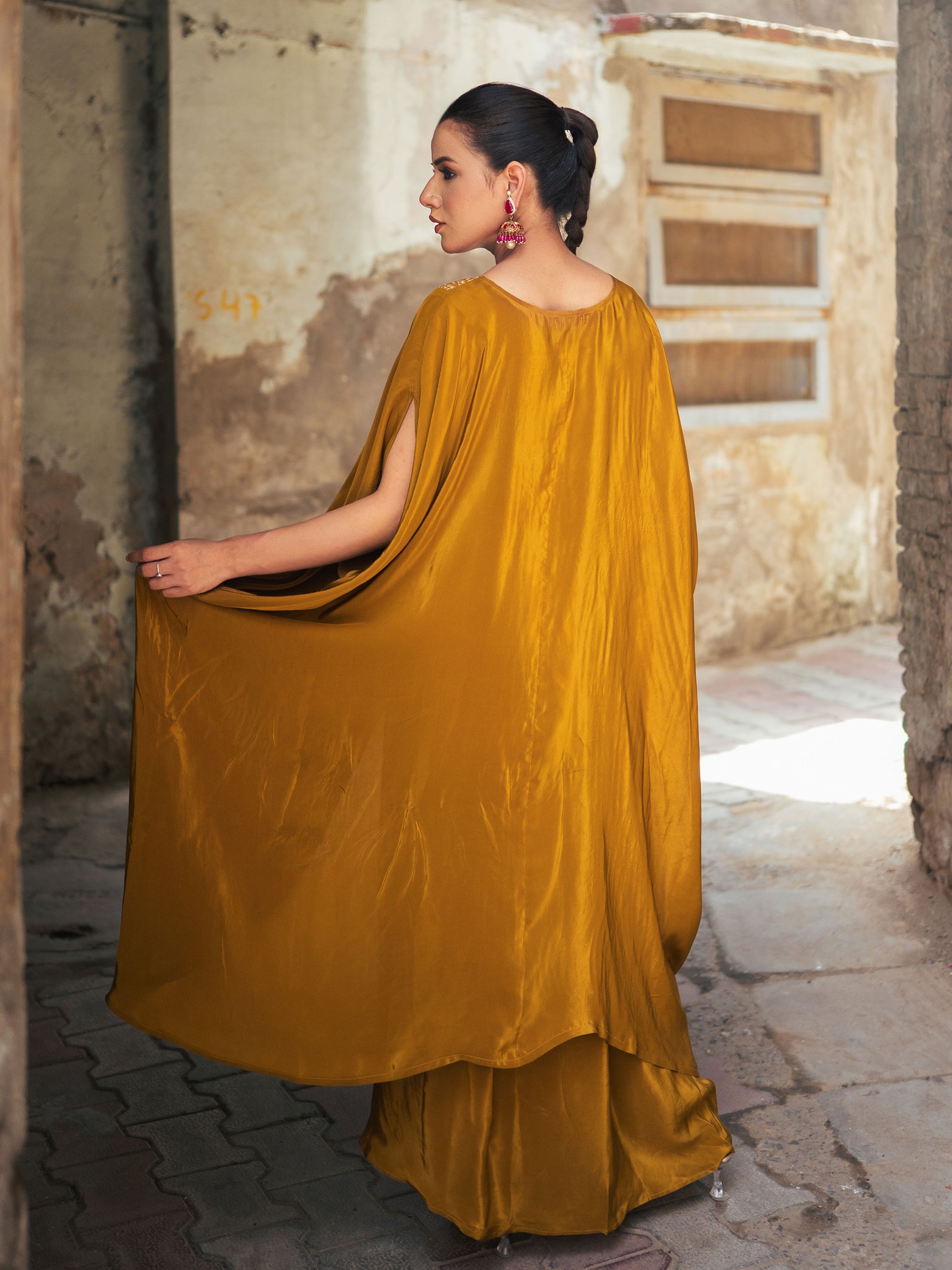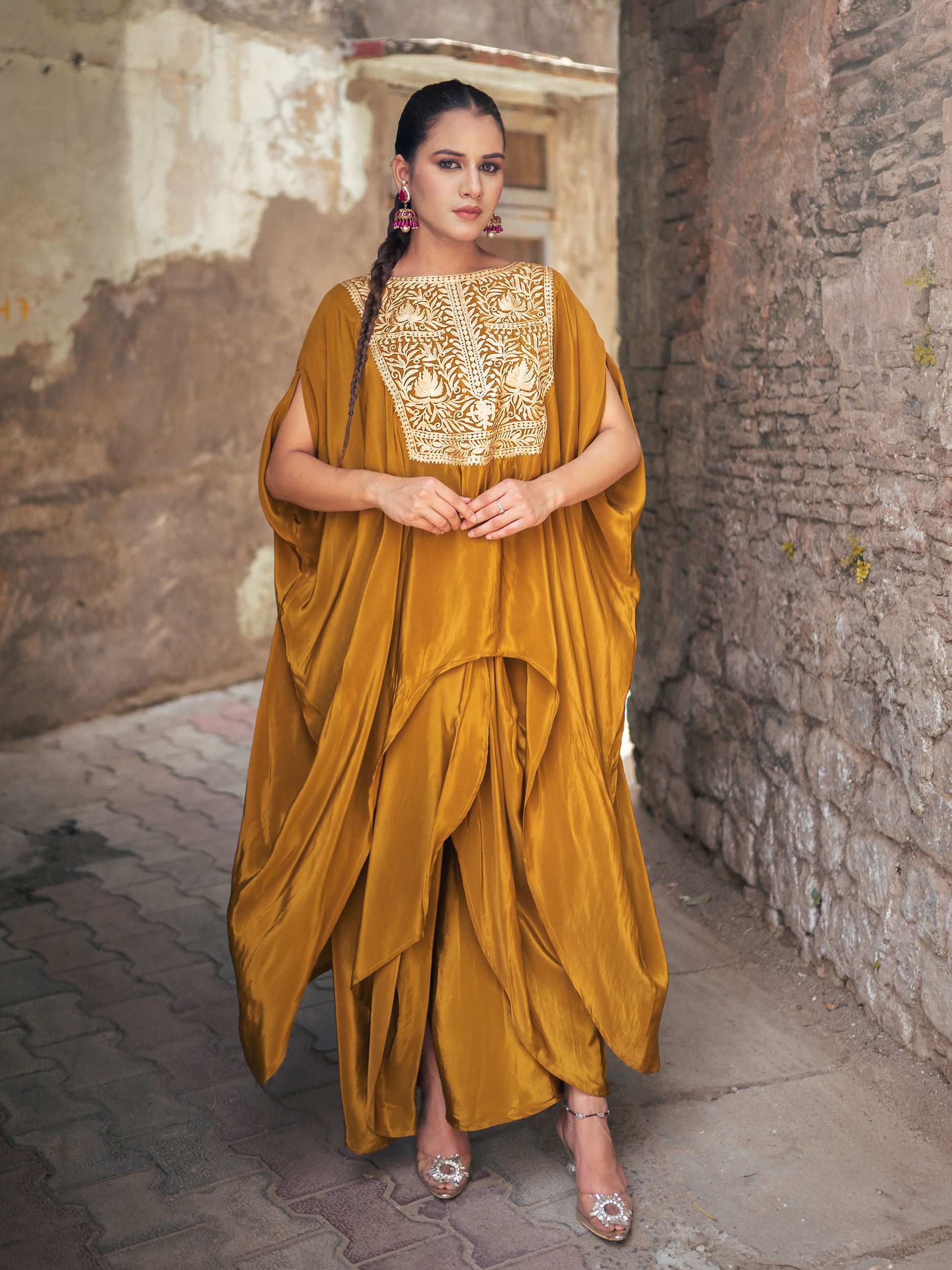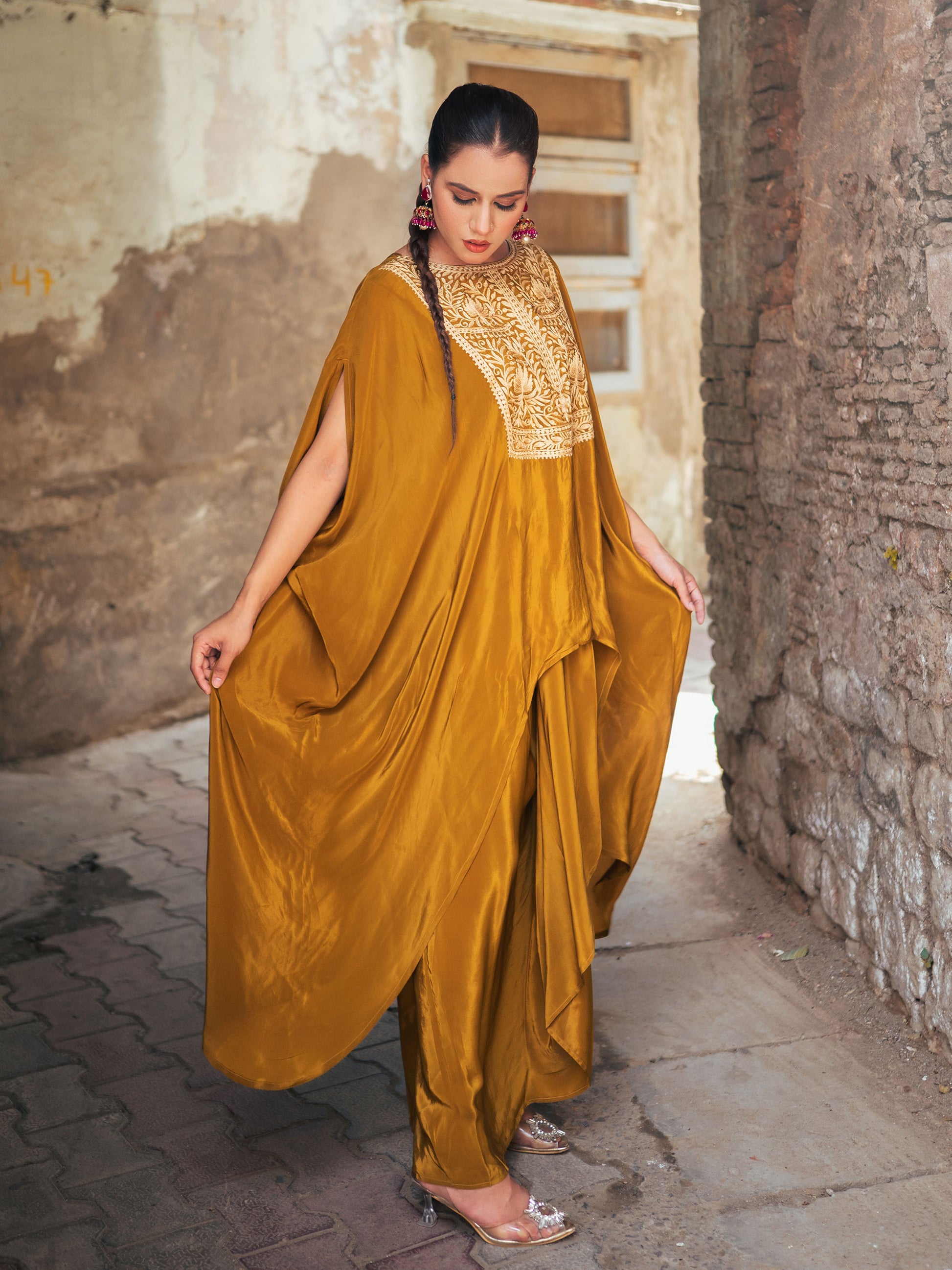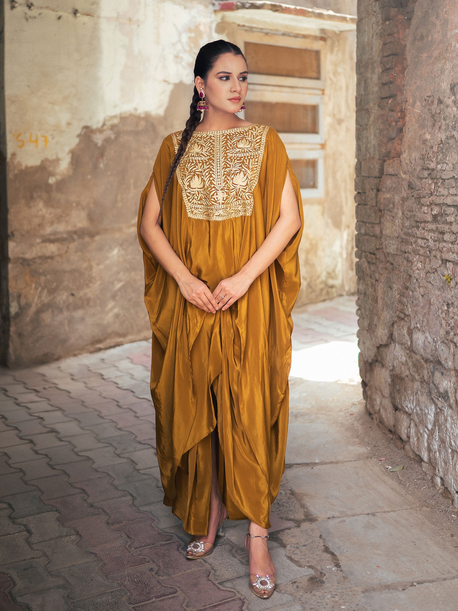 The Ghazal mustard kaftan set is adorned with intricate "Kashmiri Golden Tilla" embroidery, reflecting timeless elegance. It comes with a crepe fabric kaftan and is complemented by a matching dhoti. This set offers a perfect blend of traditional artistry and modern comfort, ideal for making a striking impression at any celebration.