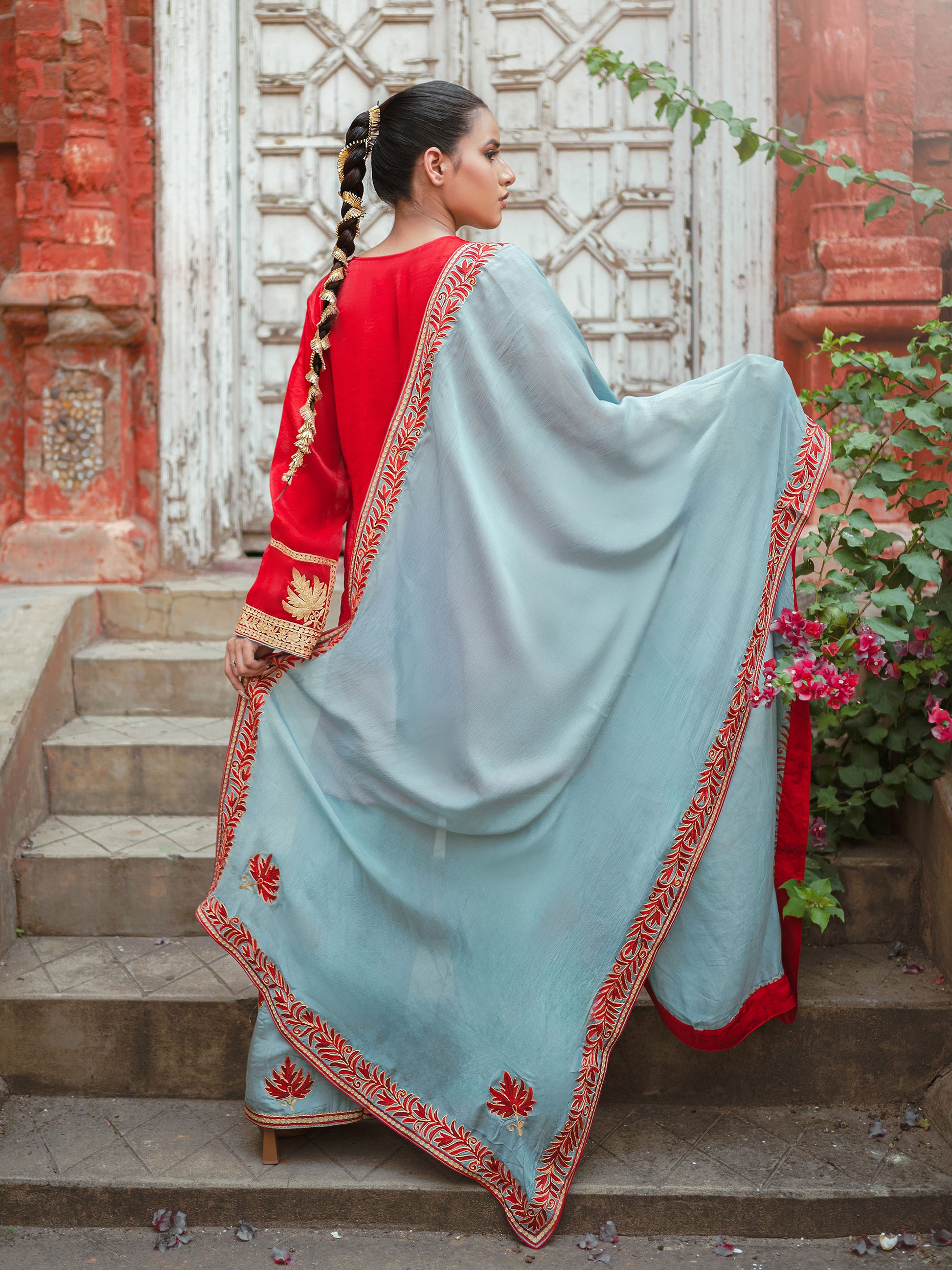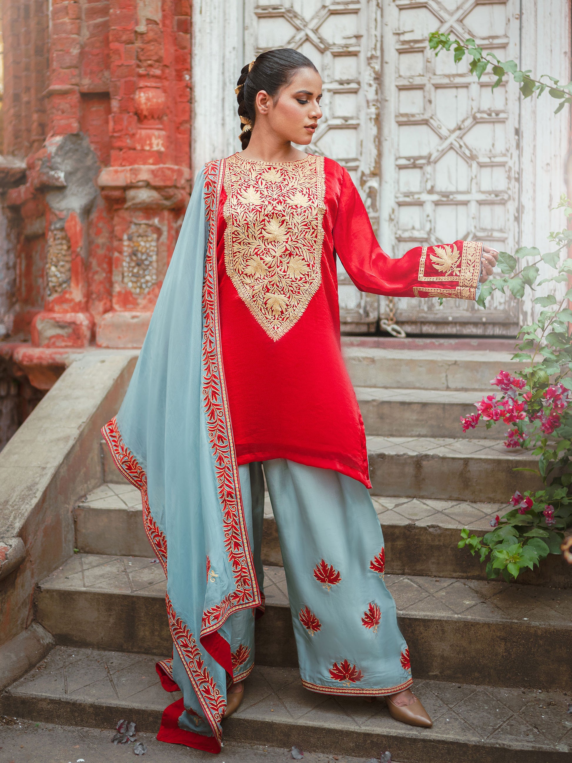 This Ghazal red & sky blue suit set showcases exquisite "Kashmiri Golden Tilla and Red Aari" embroidery and comes with an elegant silk dupatta. Crafted from silk, this red shirt paired with the sky blue farshi salwar is perfect for any special occasion.