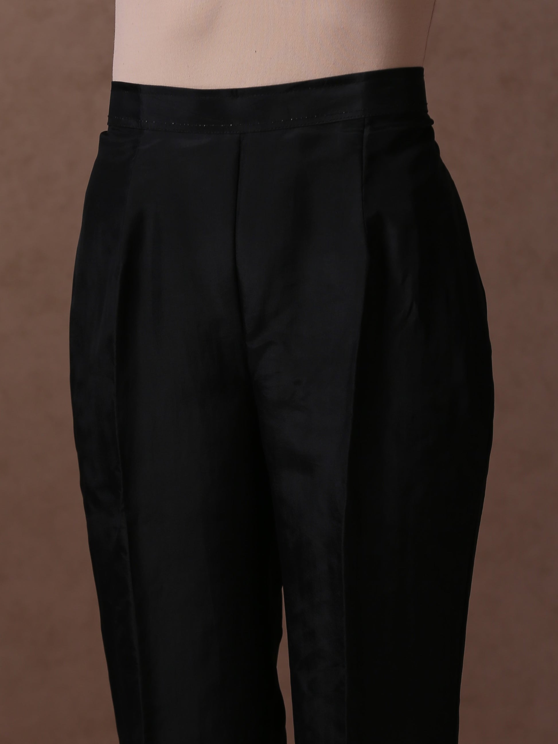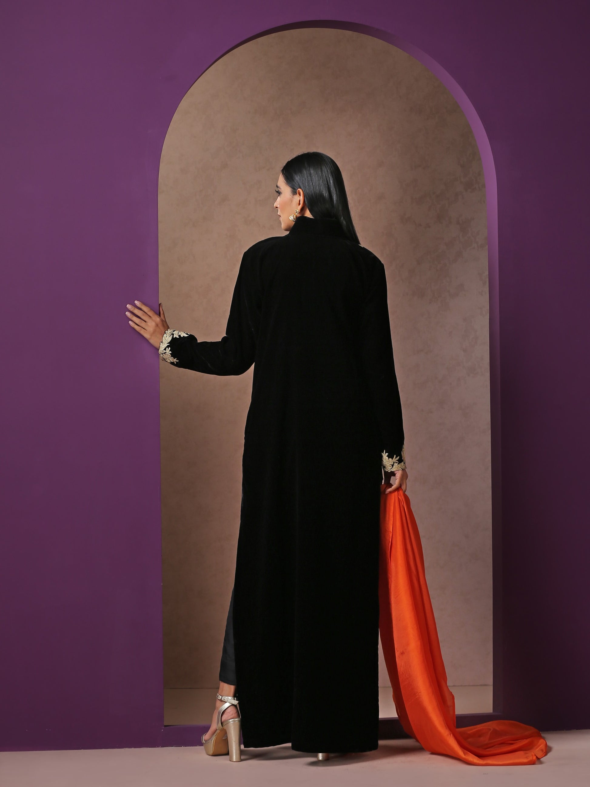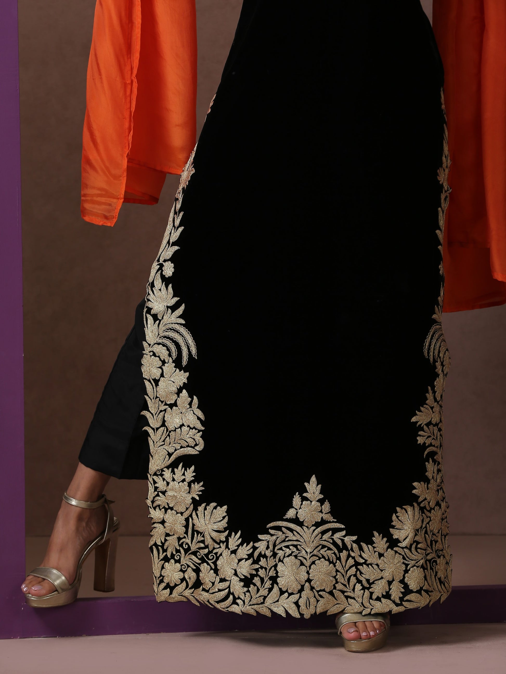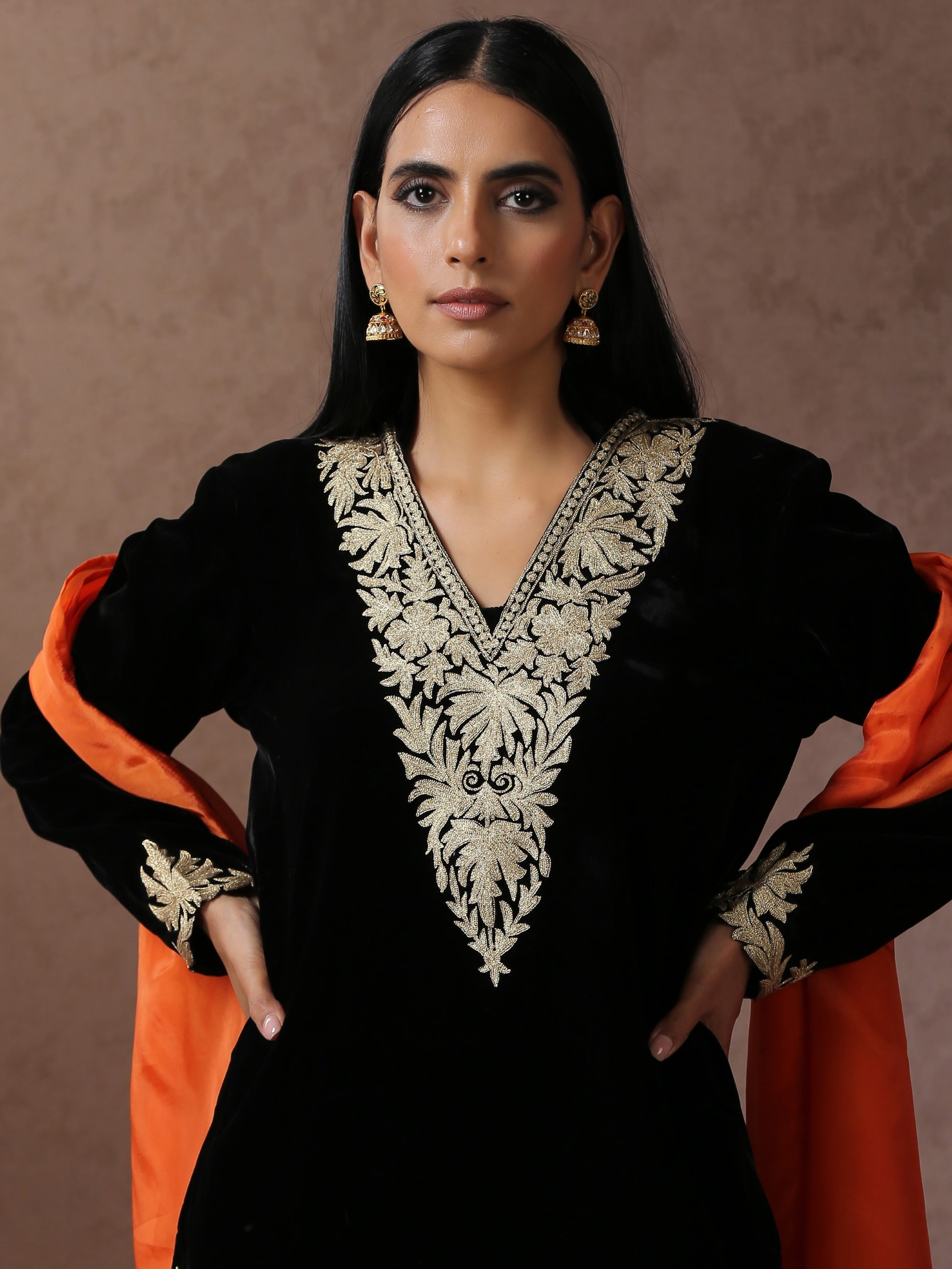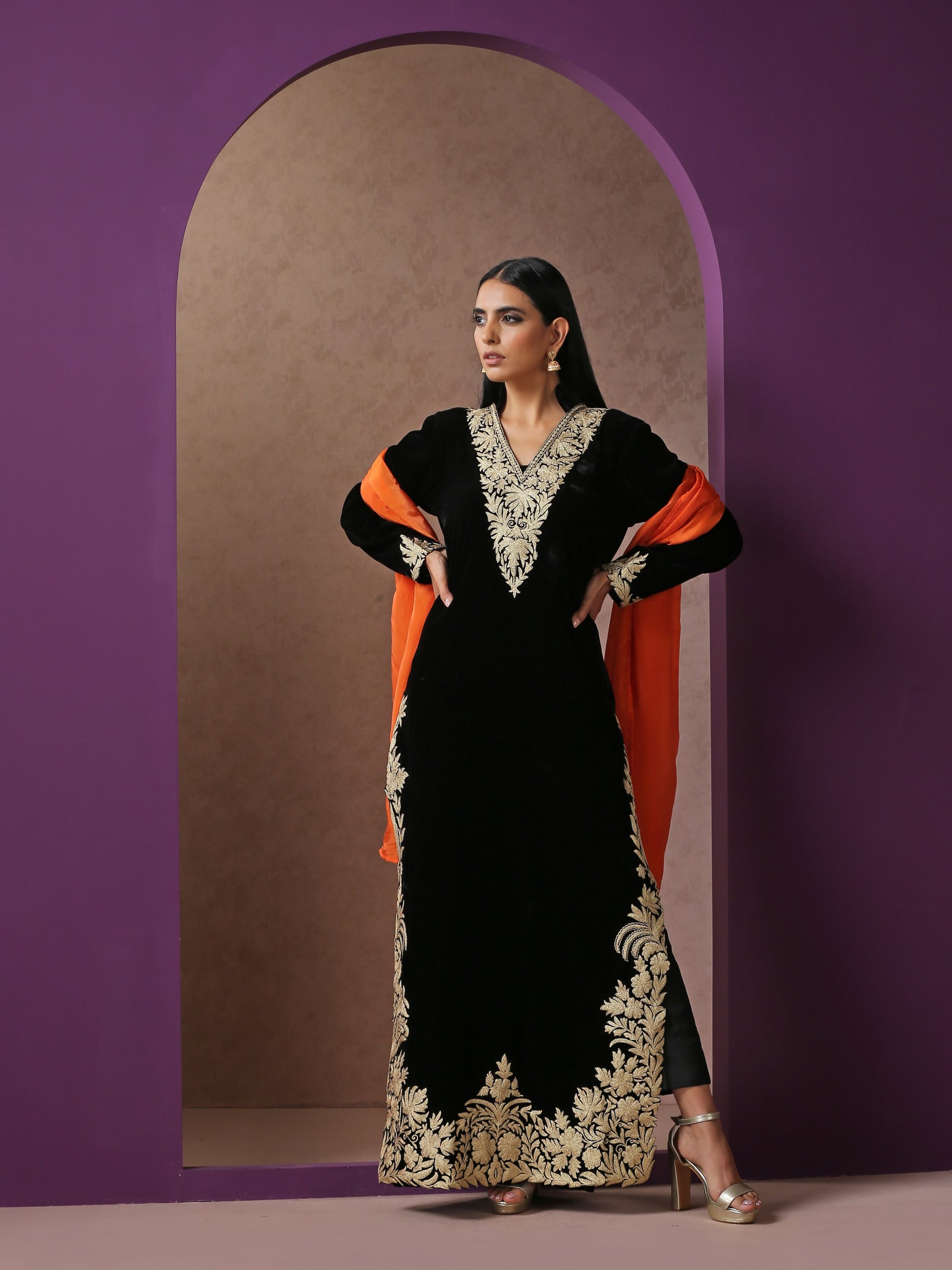 This makhmal velvet suit set consists of a v-neck, long sleeve shirt and straight fit pants designed with "Kashmiri Golden Tilla" embroidery and an orange silk dupatta.