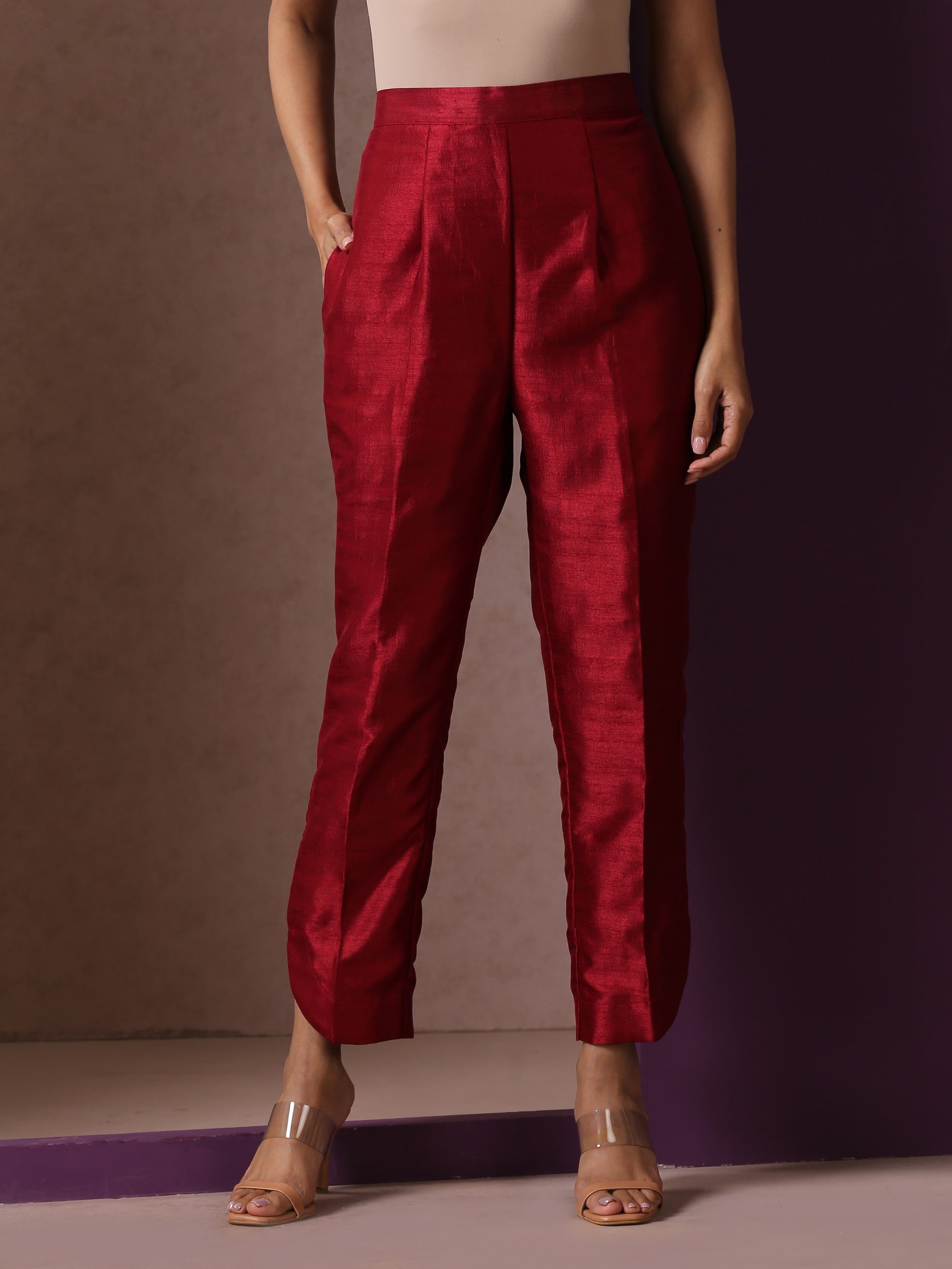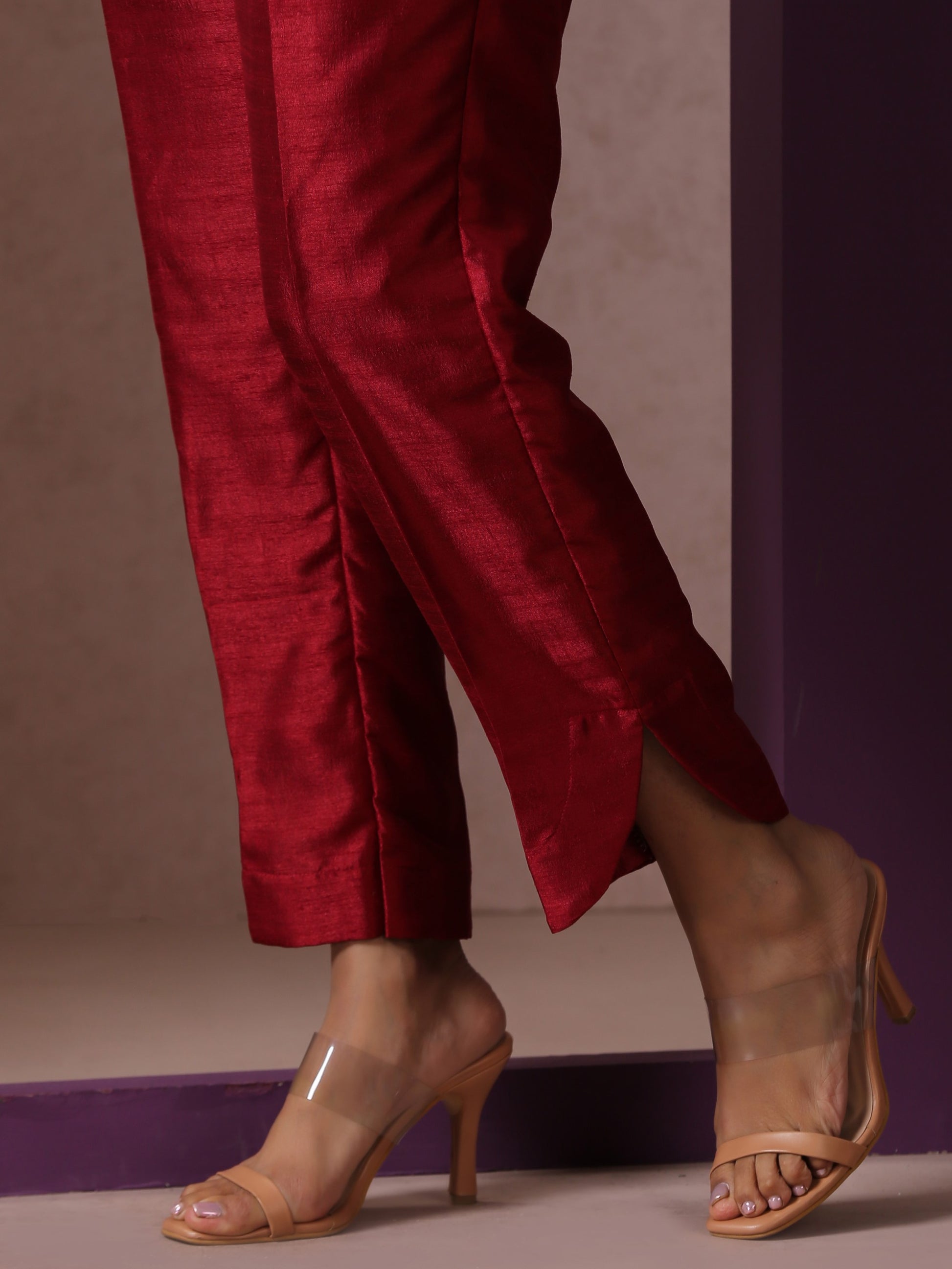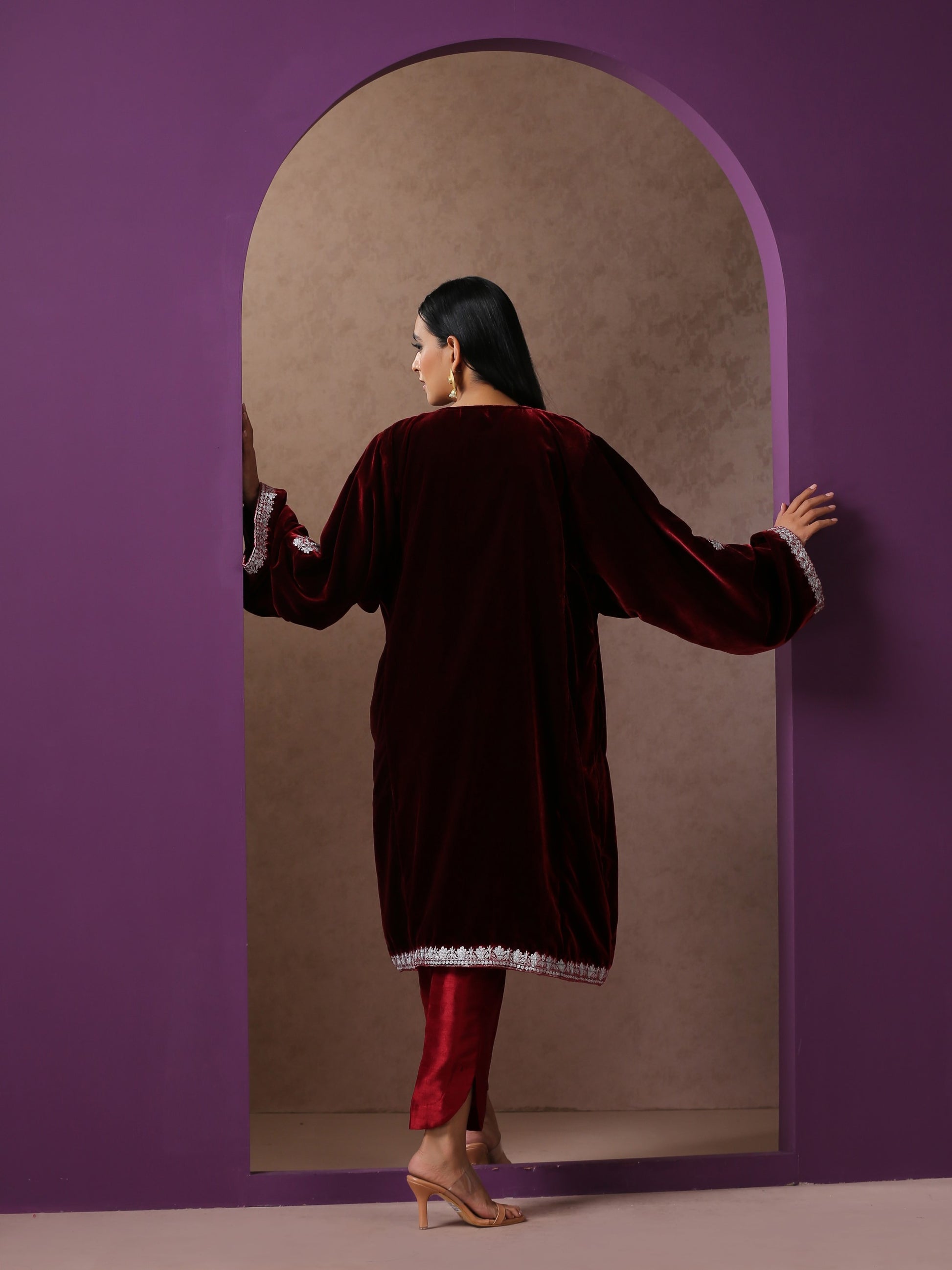 A maroon makhmal long velvet qurab pheran with loose sleeves designed with "Kashmiri Silver Tilla" embroidery. Paired with straight silk pants.