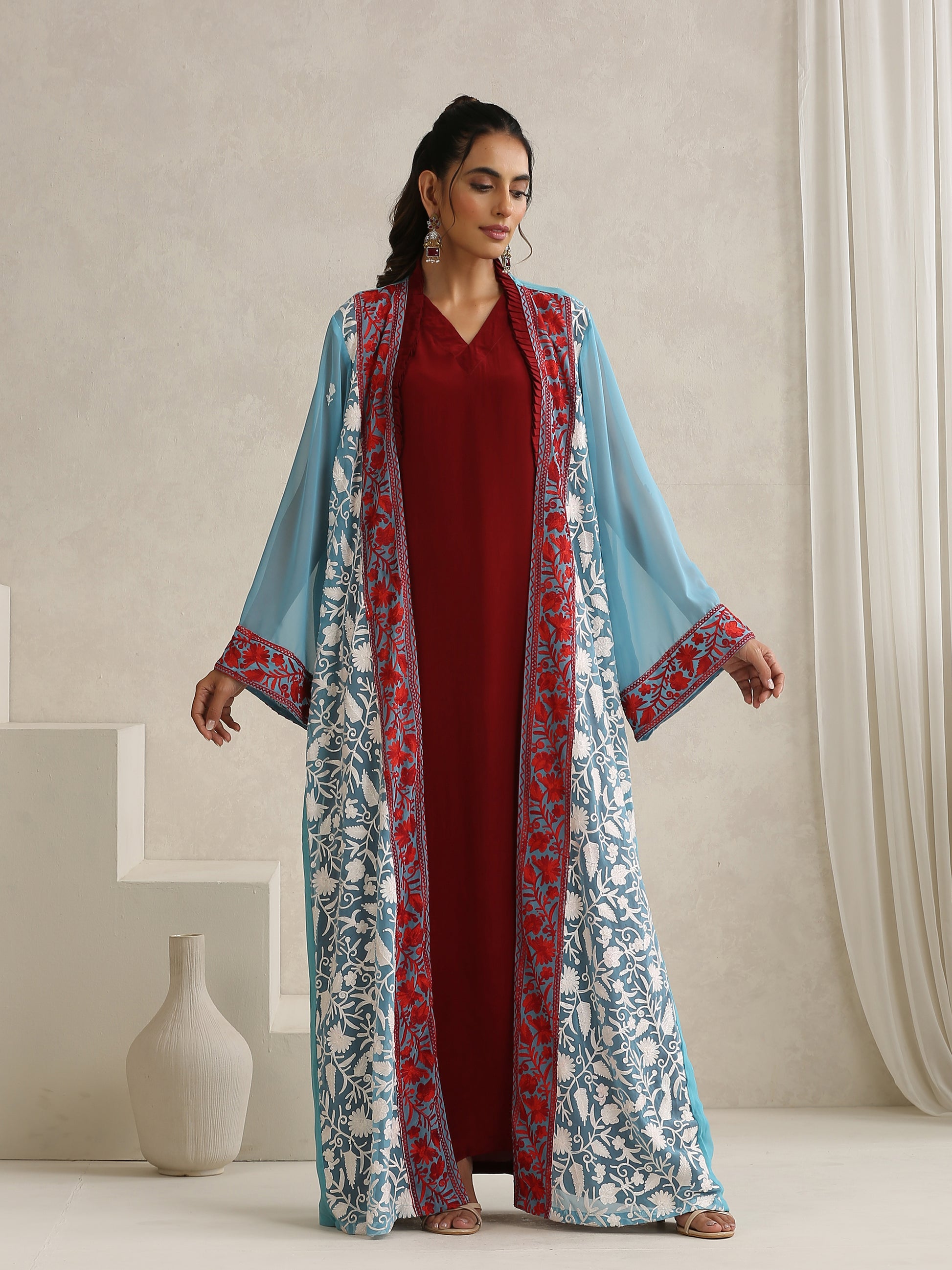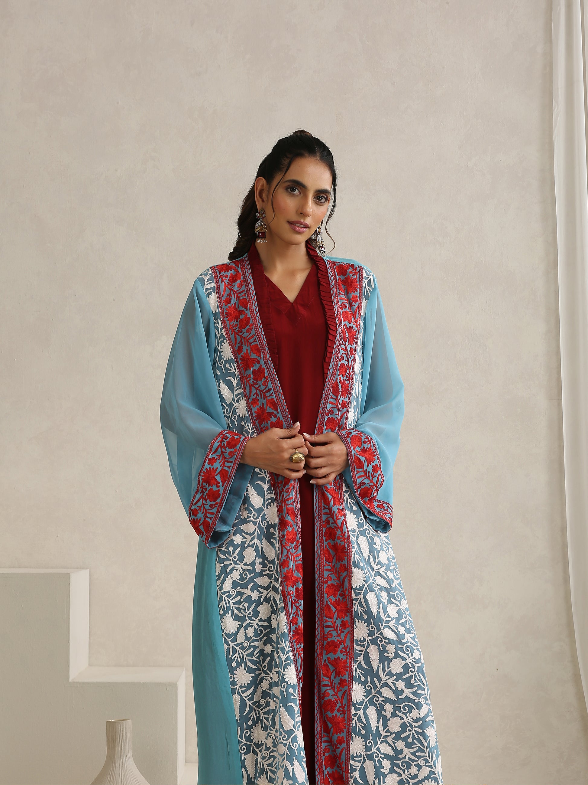 Experience the stunning beauty of the Nargis Kashmiri Embroidered bisht, complete with a crepe inner dress set that showcases exquisite "Kashmiri White Aari" embroidery. The tailored fit, along with the maroon long crepe dress and blue georgette bisht, adds an elegant touch to the ensemble.