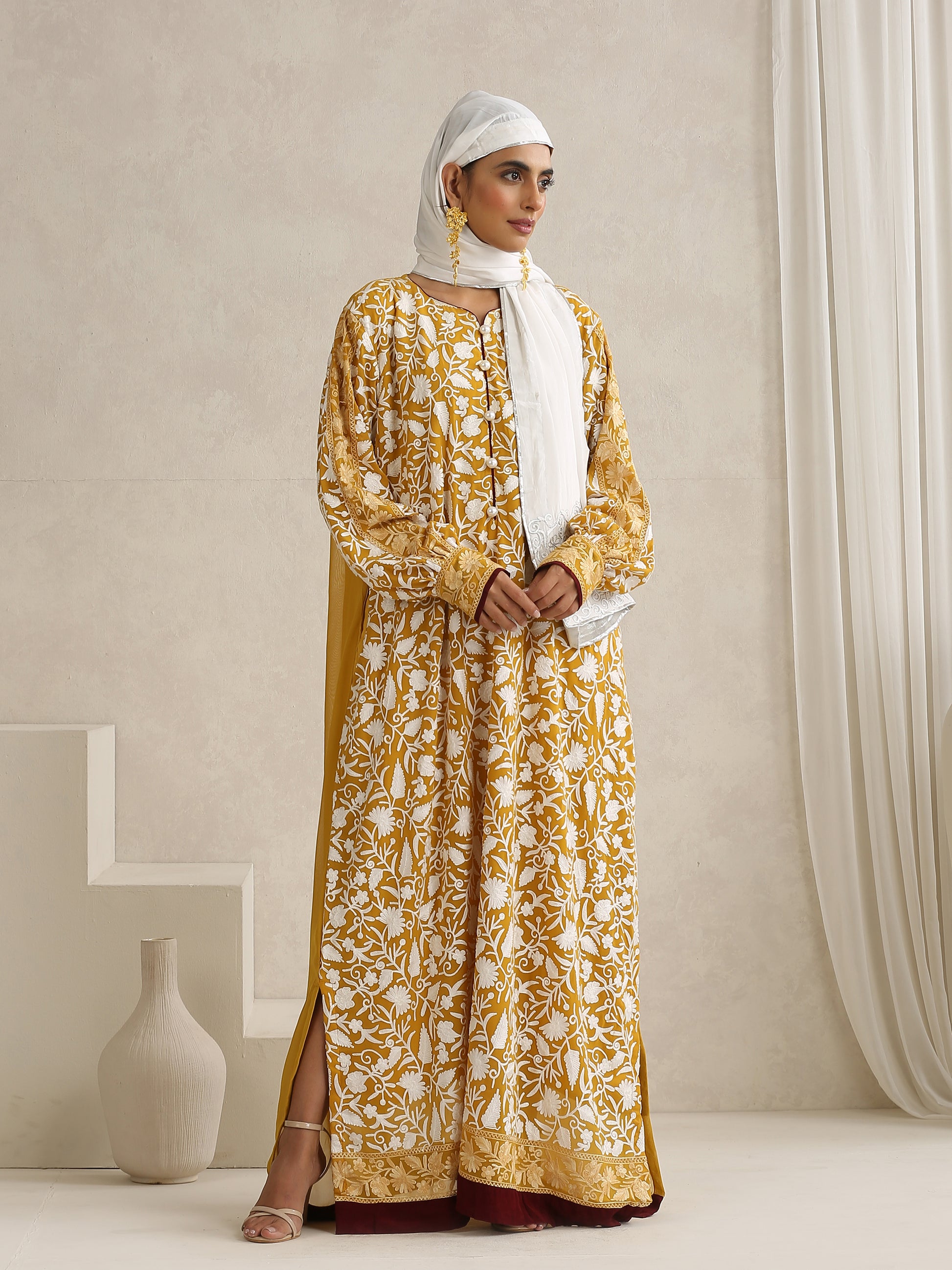 Nargis Mustard & White Abaya with Sheila