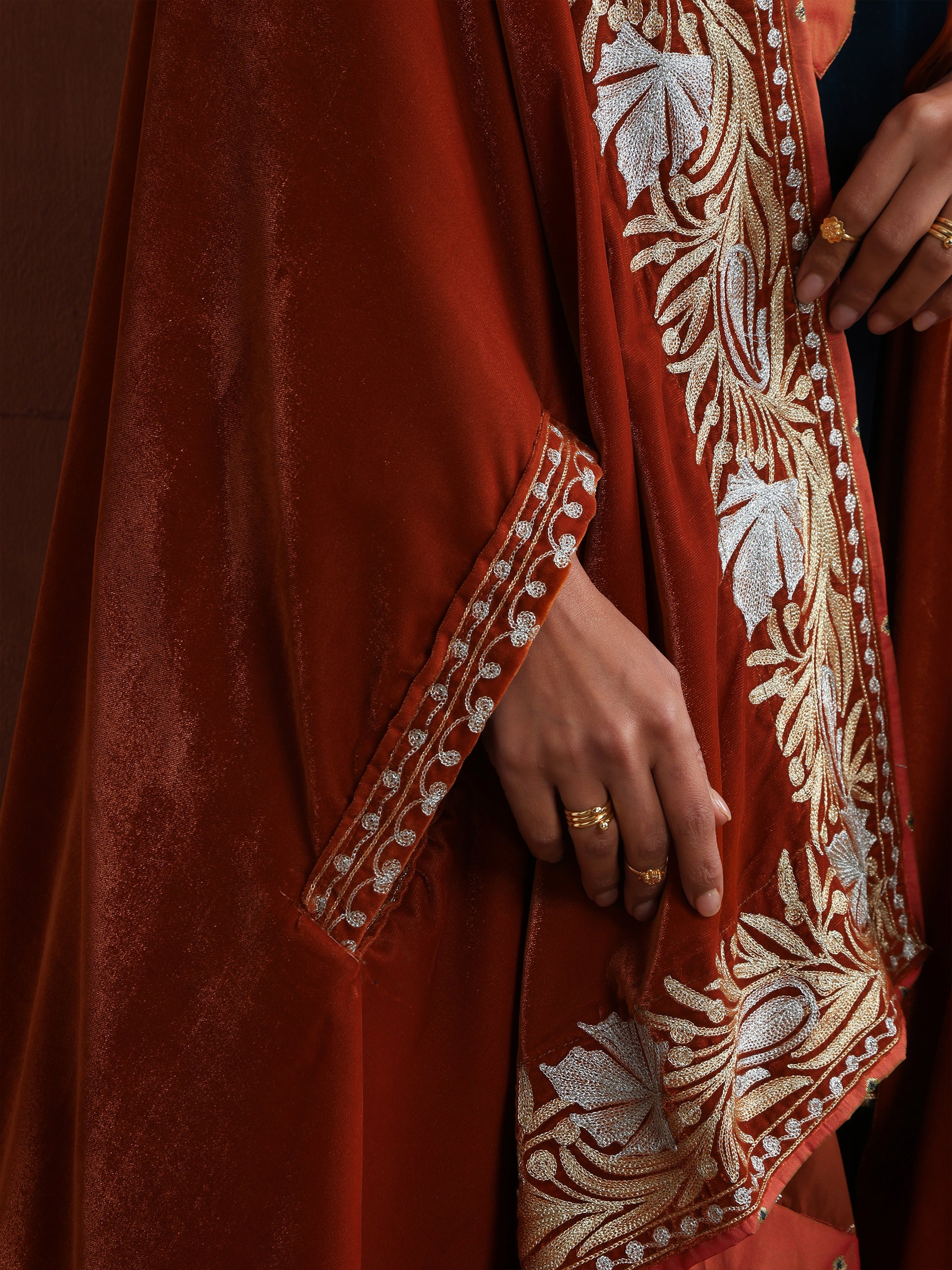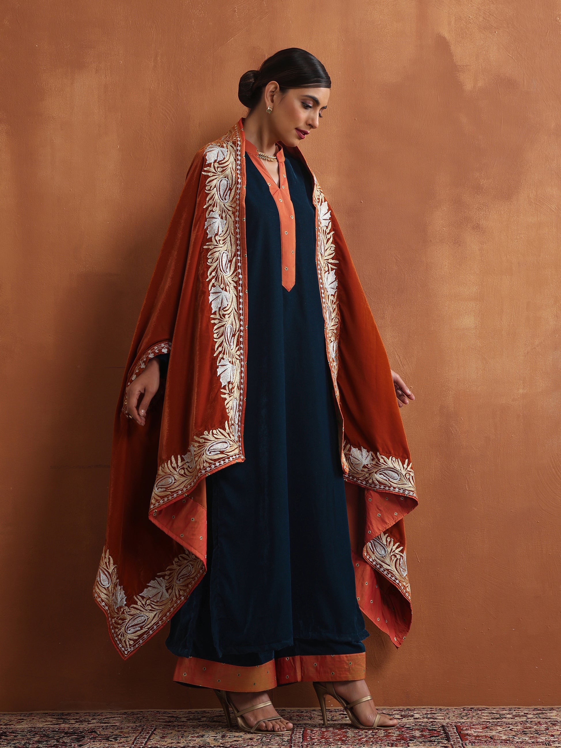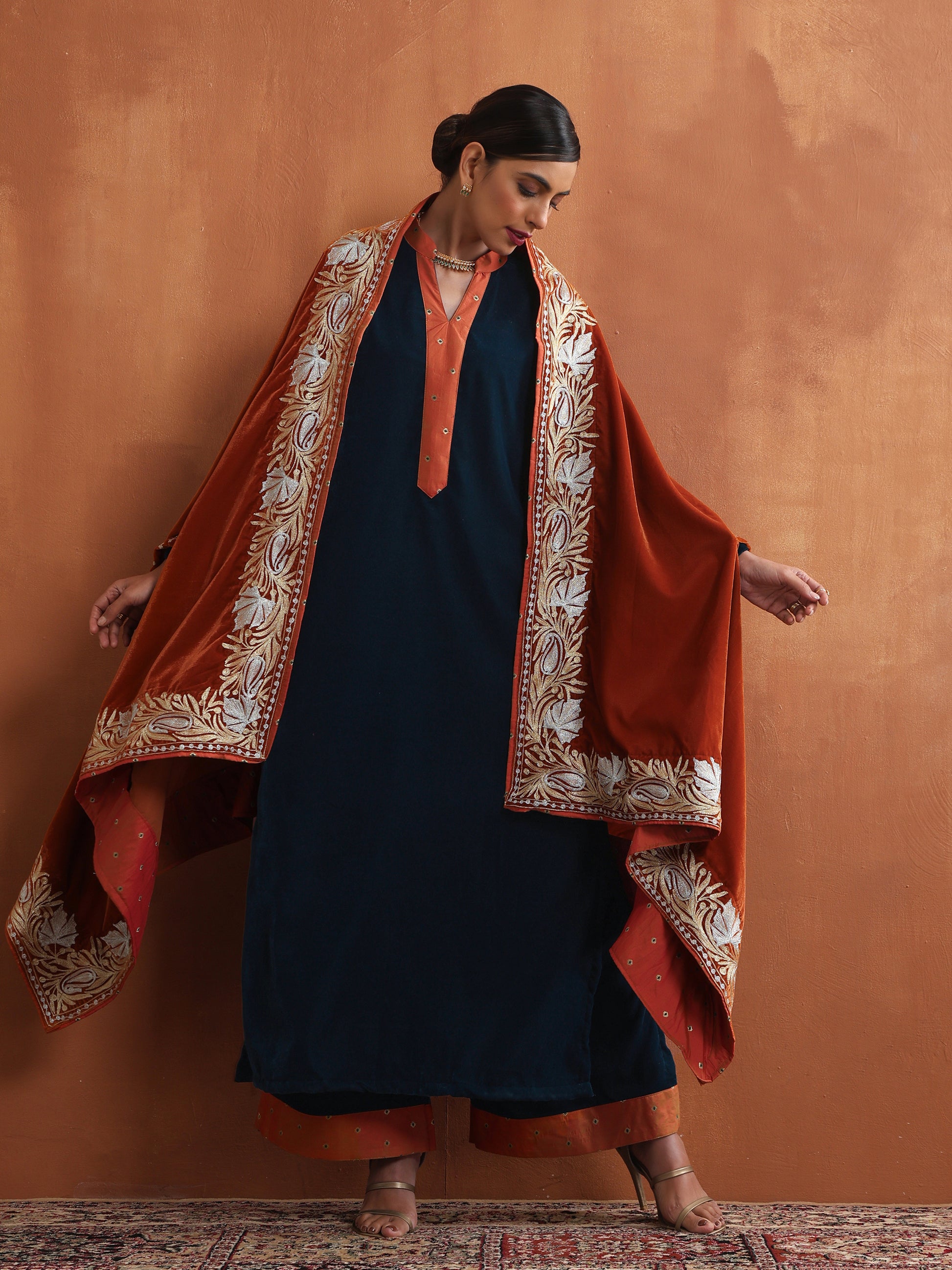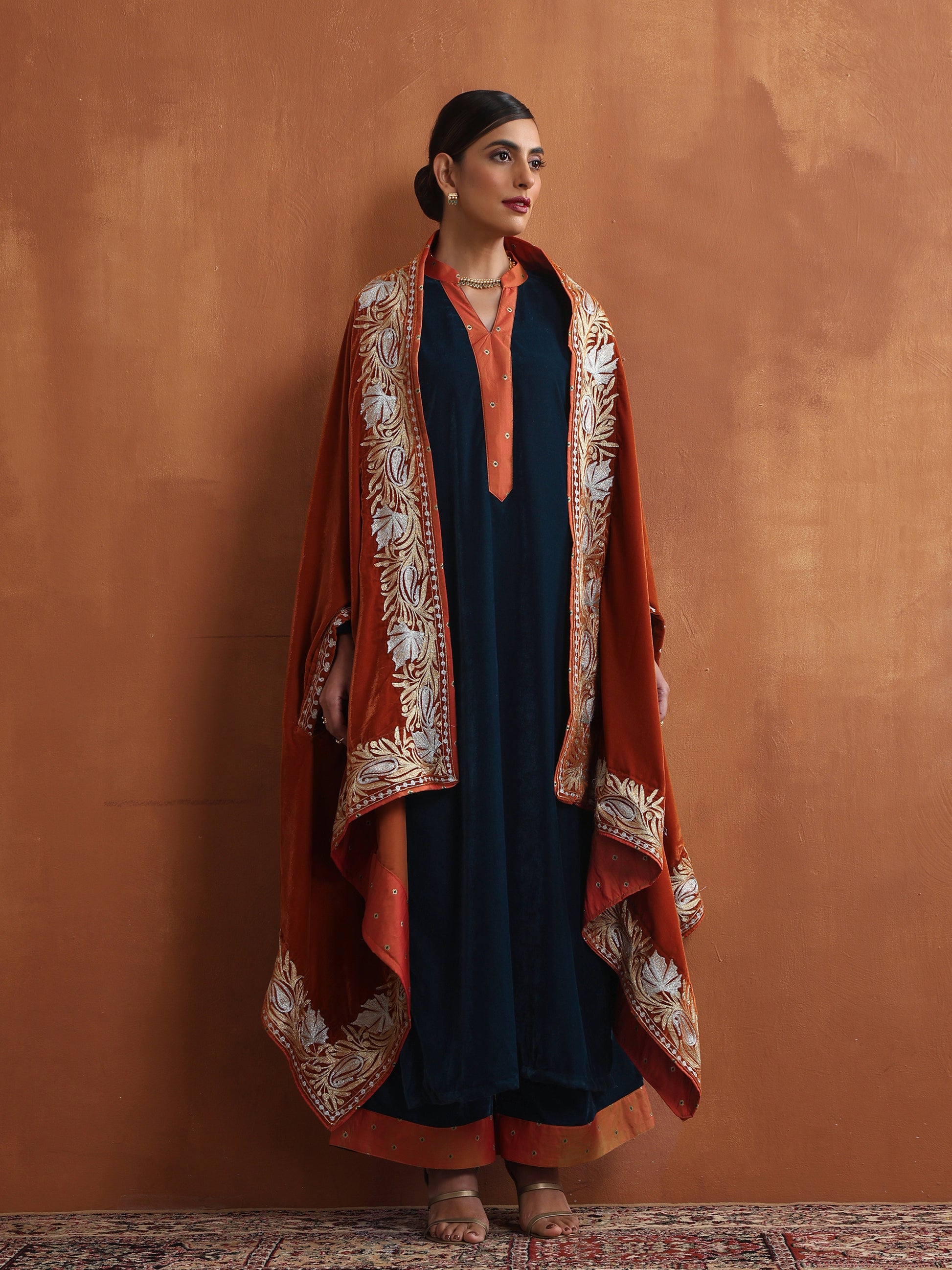 This cape set combines teal blue and rust colors with stunning "Kashmiri Golden Tilla" embroidery. It includes a straight kurta, velvet flare pants, and an intricately embroidered rust cape. Must-have for any fashion-forward individual.