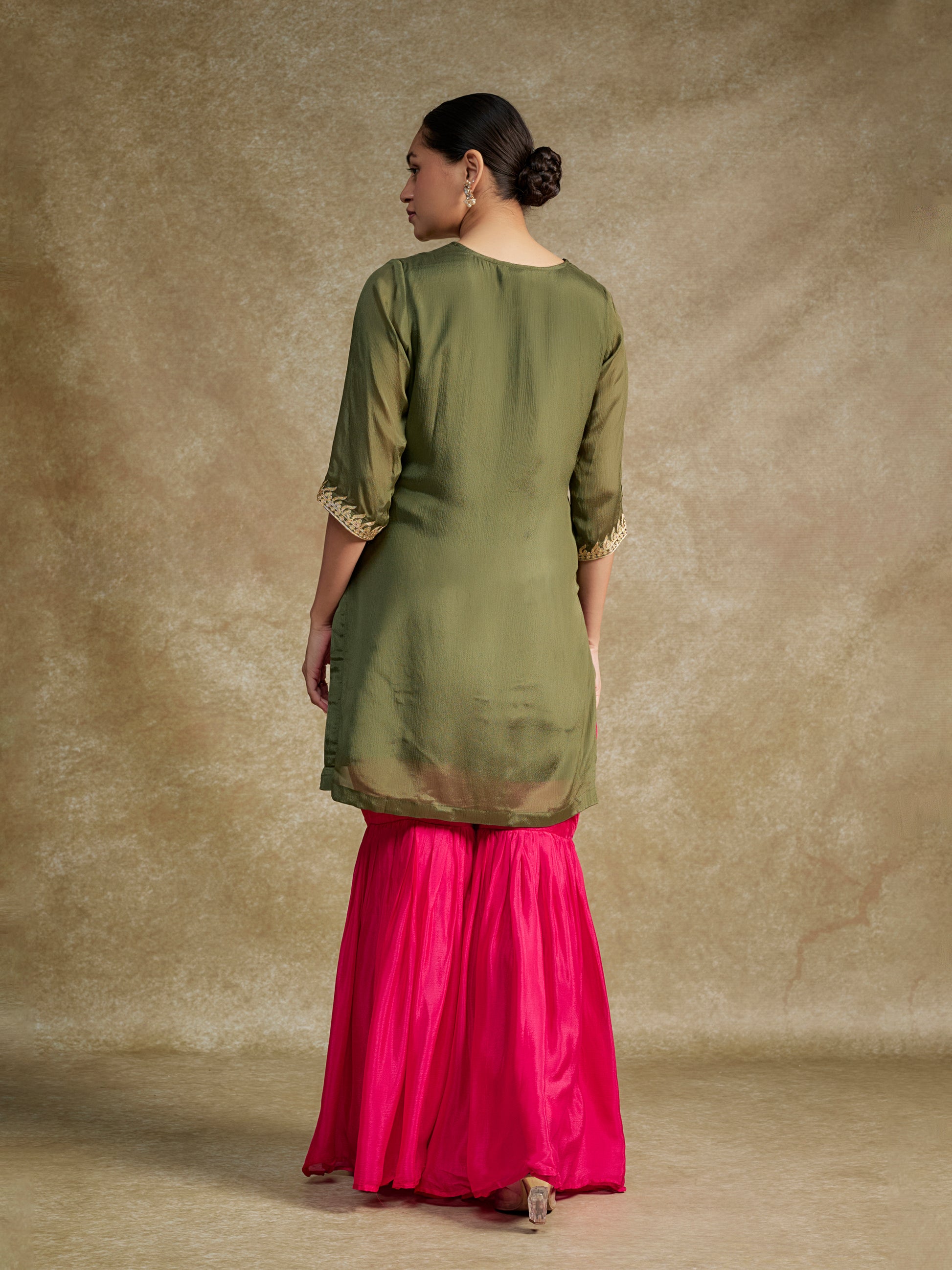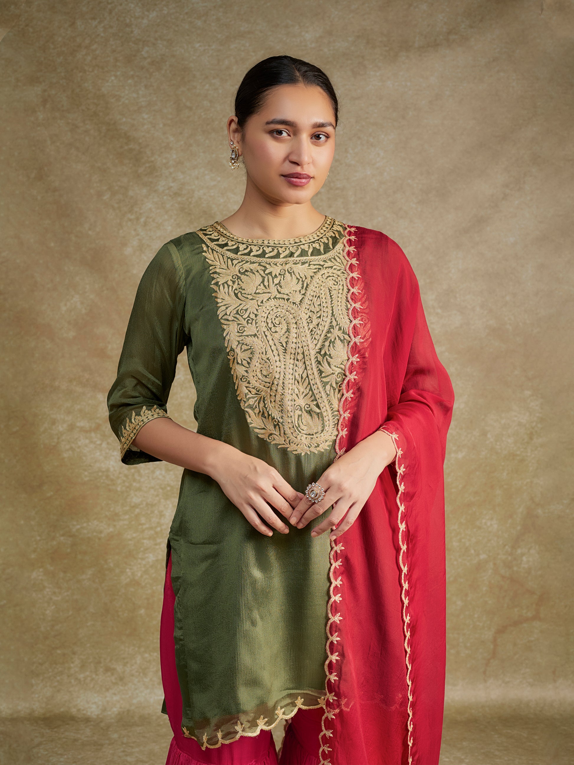This suit set features charming "Kashmiri Golden Tilla" embroidery and includes sharara pants and an organza maroon dupatta.
