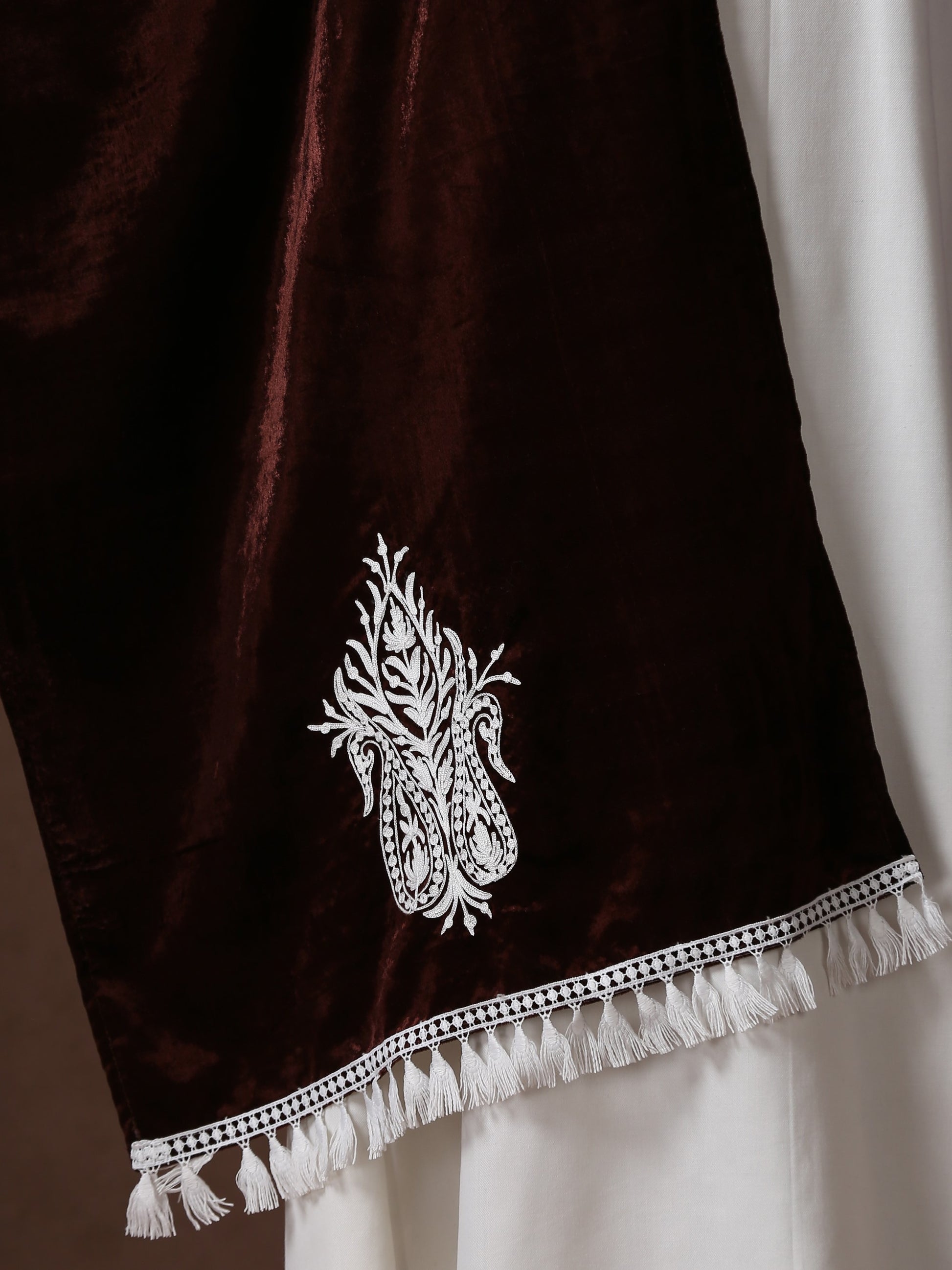 Featuring a brown velvet stole with "Kashmiri Aari" embroidery and white lace at the edges.