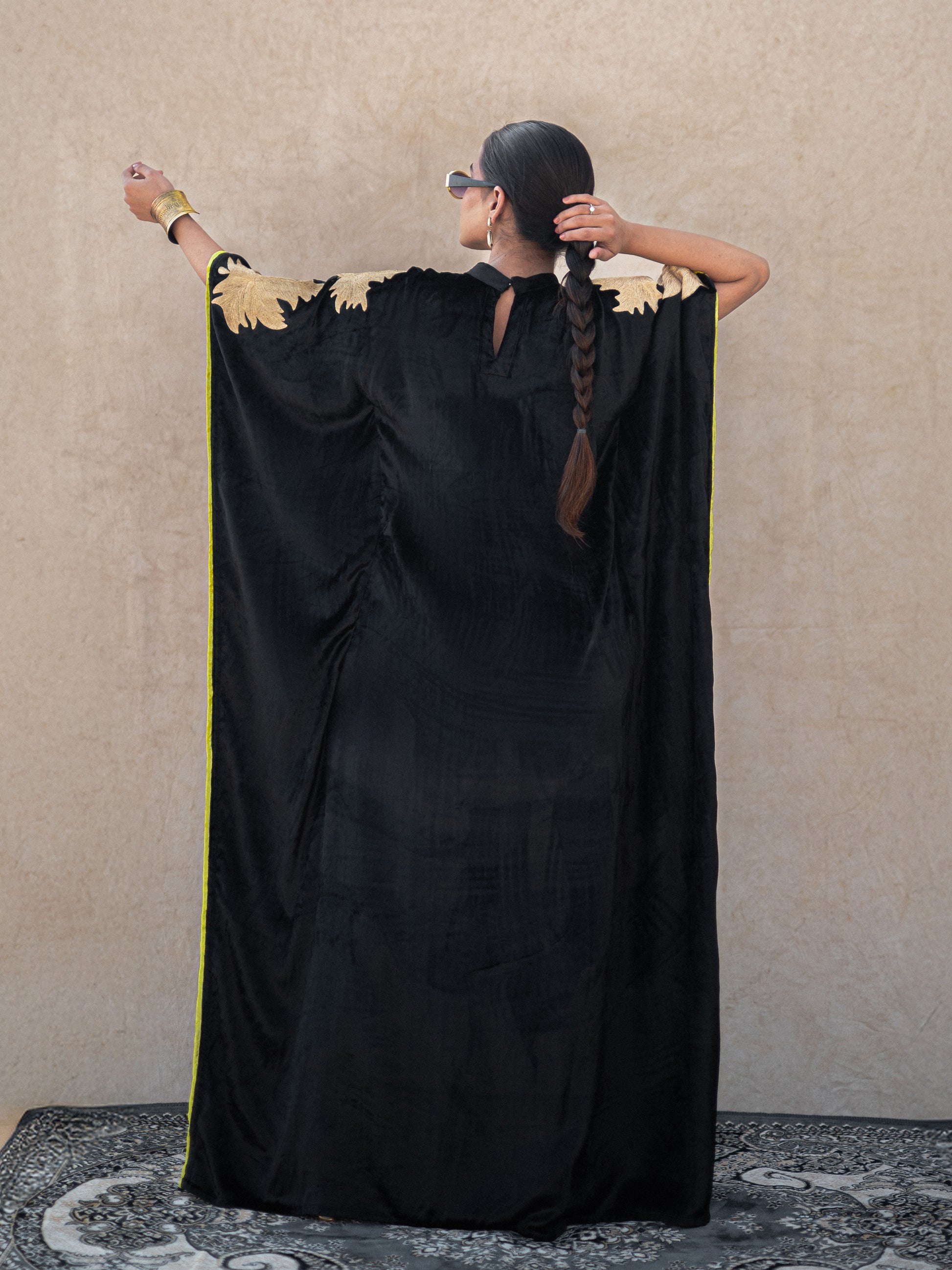 Make a bold statement with the Zoon black & neon kaftan, where heritage meets high fashion. This stunning creation features a black velvet base adorned with intricate "Kashmiri Golden Tilla" embroidery that showcases centuries of textile artistry. The eye-catching neon piping along the sides introduces a daring modern edge, creating an unforgettable contrast that captures attention instantly. Designed for those who refuse to blend in, this kaftan offers unparalleled elegance and individuality.