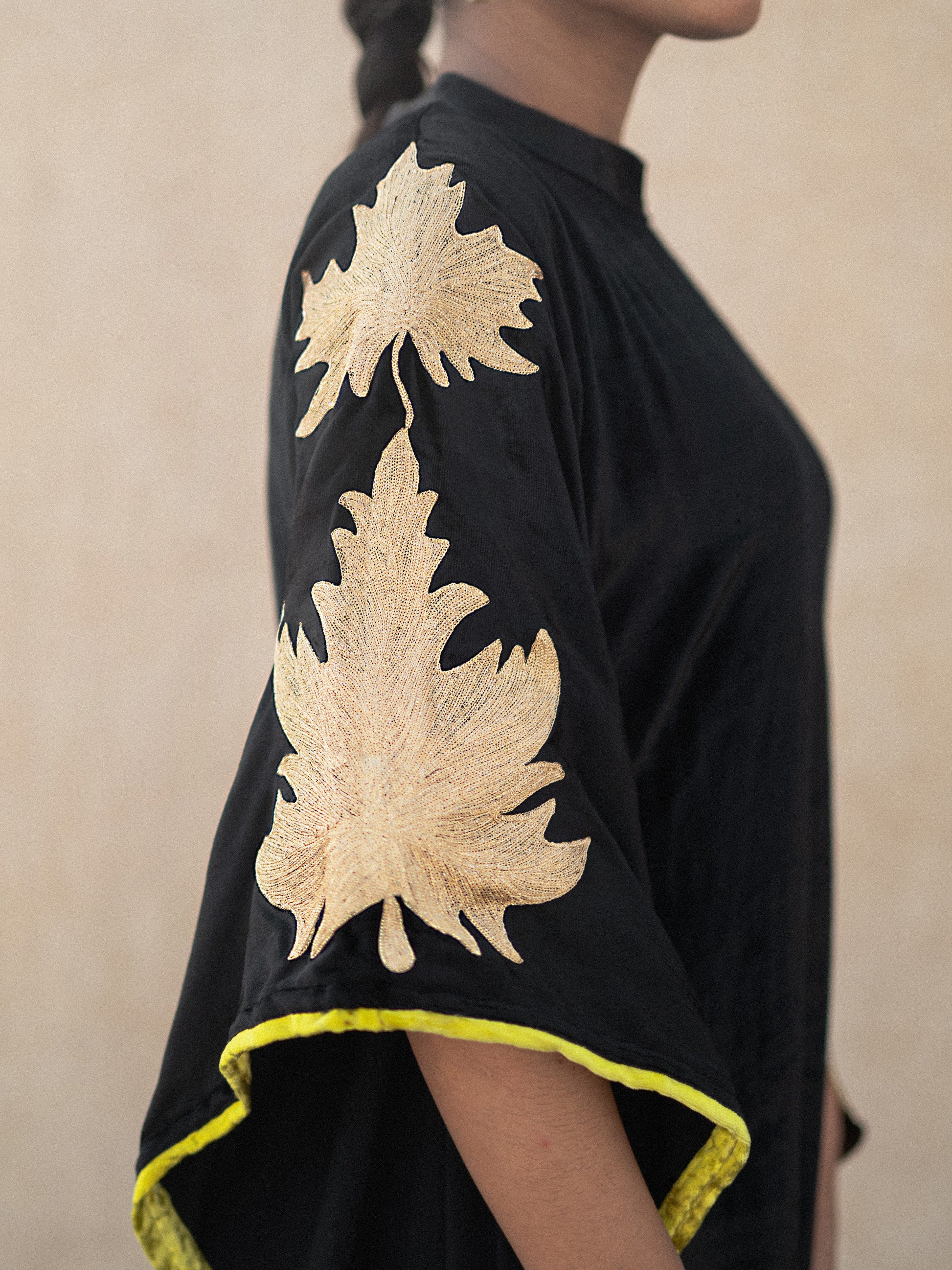 Upper: Black Velvet Kaftan is Designed with Kashmiri Golden Tilla & Neon Piping on Sides