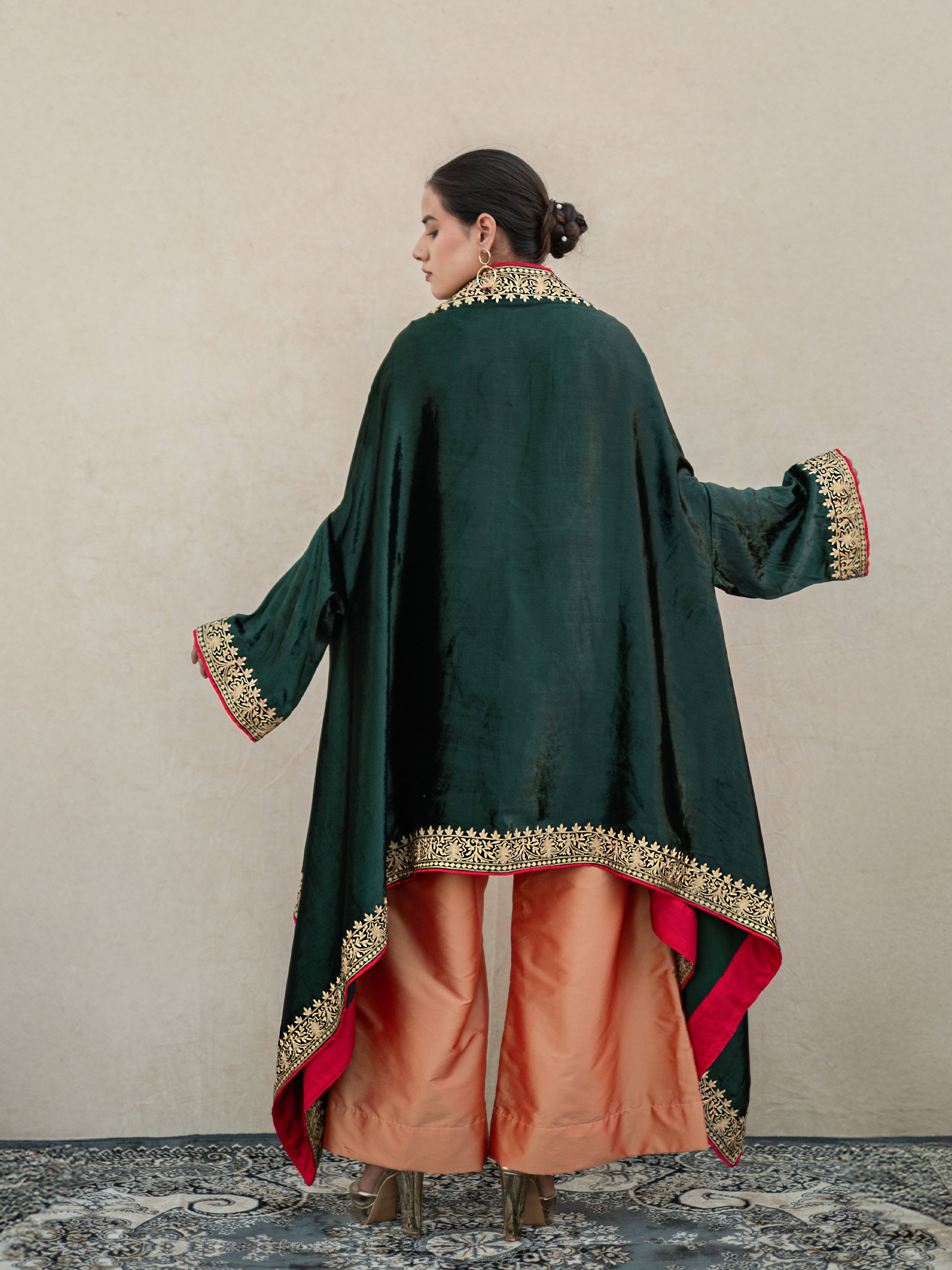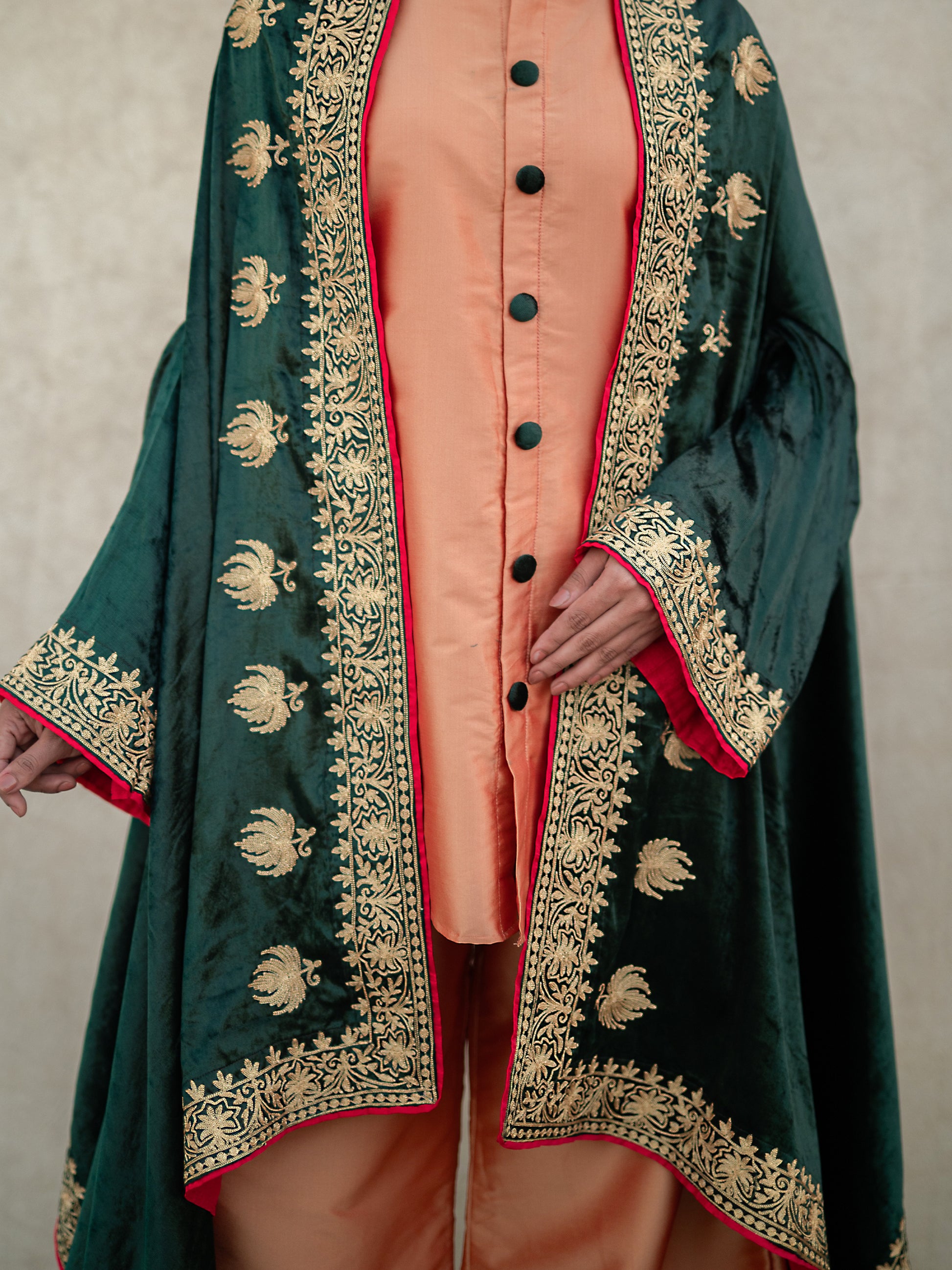 This Zoon emerald green cape set represents refined ethnic elegance with an intense focus on detail. The collection comprises a peach silk short kurta with a front-button design, coordinated silk palazzo pants, and a striking emerald-green velvet cape. Each piece showcases authentic "Kashmiri Golden Tilla" embroidery.