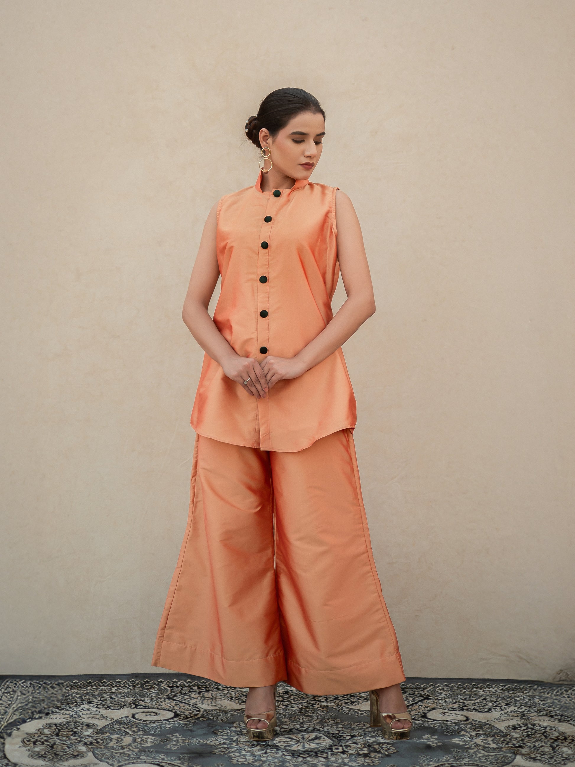 Upper: Peach Silk Short Kurta with Front Buttoned Design