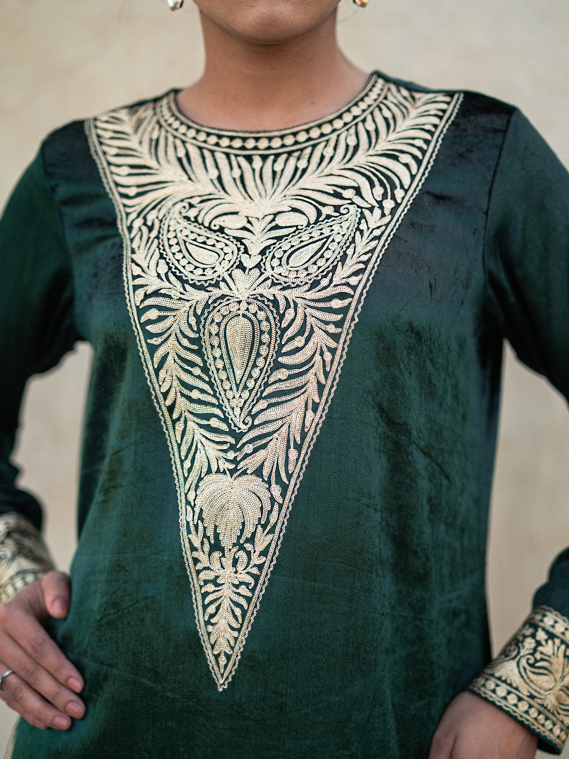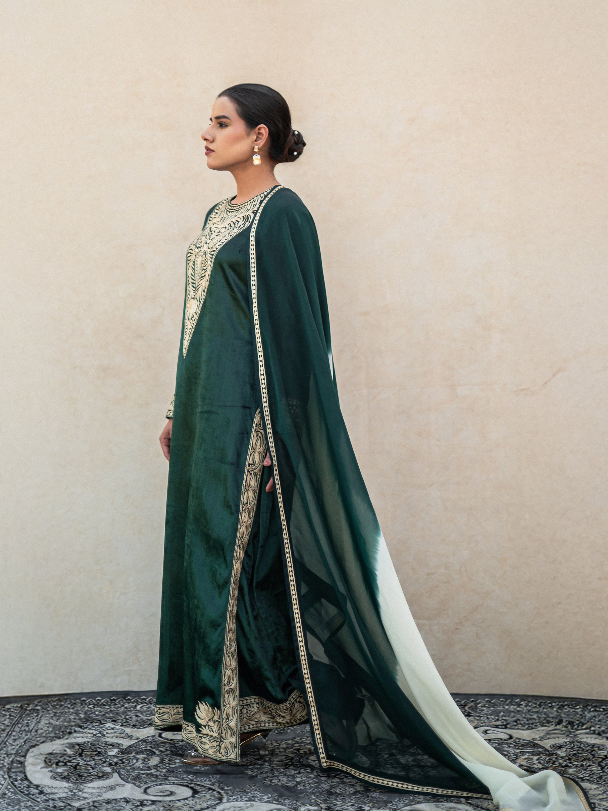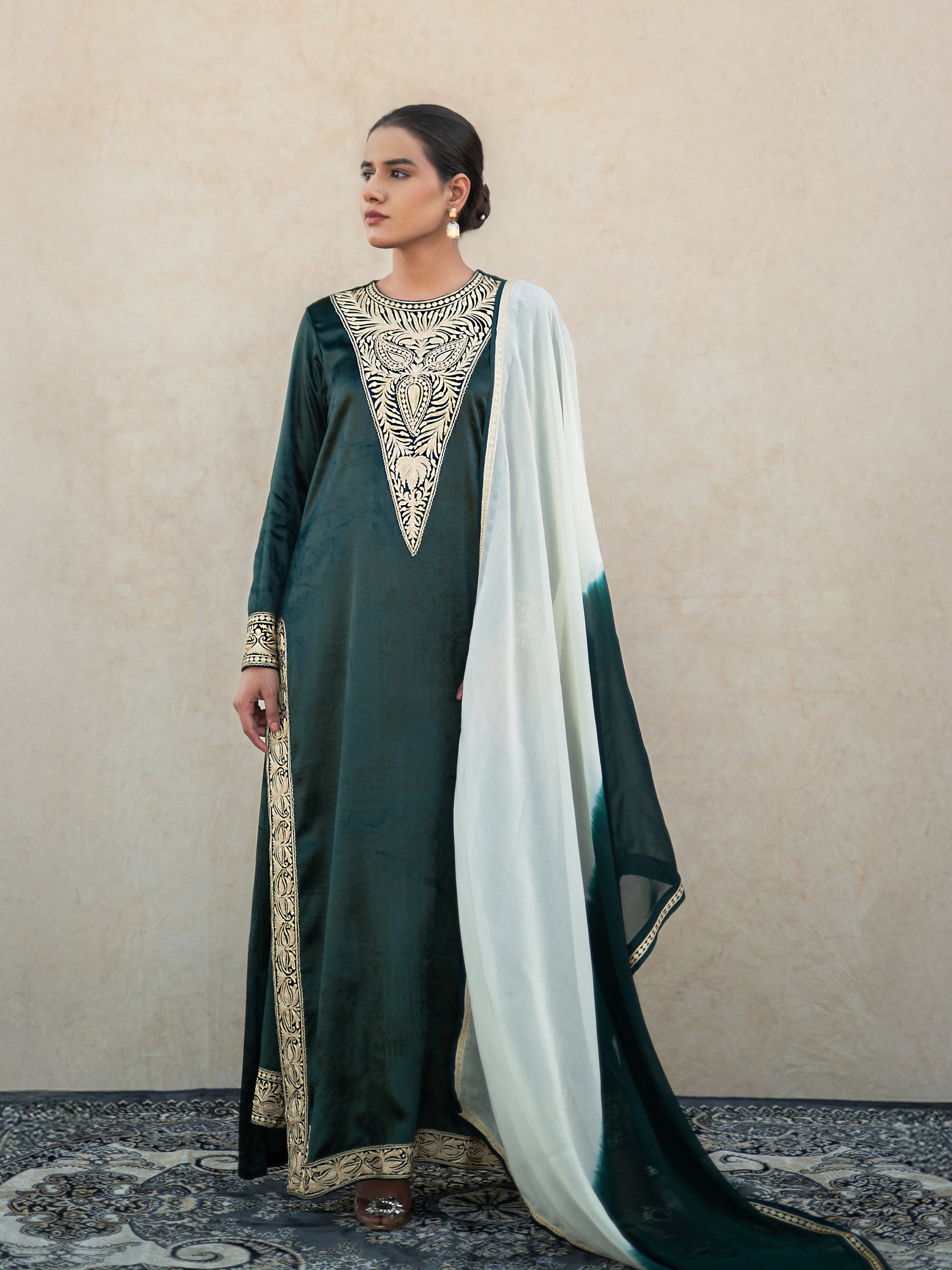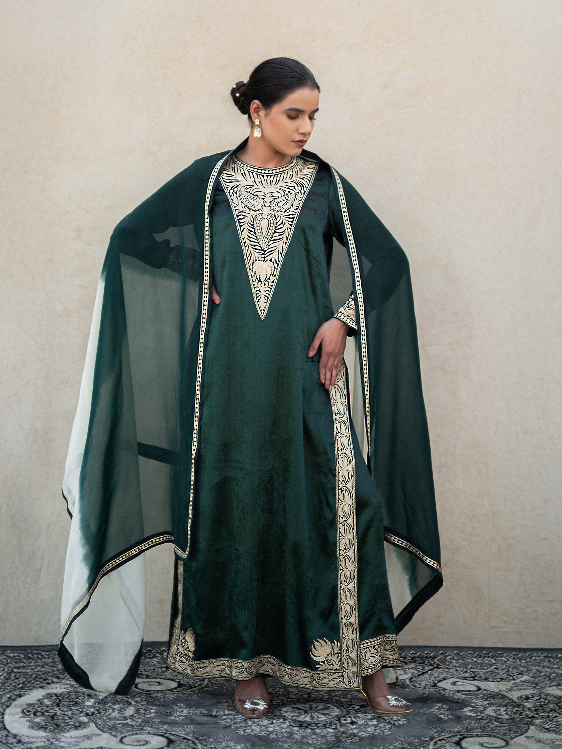 Make an unforgettable statement with the Zoon green suit set. This stunning three-piece collection features a green velvet long kurta adorned with intricate "Kashmiri Golden Tilla" embroidery that captures light and admiration in equal measure. The harmoniously coordinated velvet straight pants deliver a polished, contemporary silhouette that flatters effortlessly. Accessorize with the delicate green and off-white organza dupatta to unlock versatile styling possibilities.