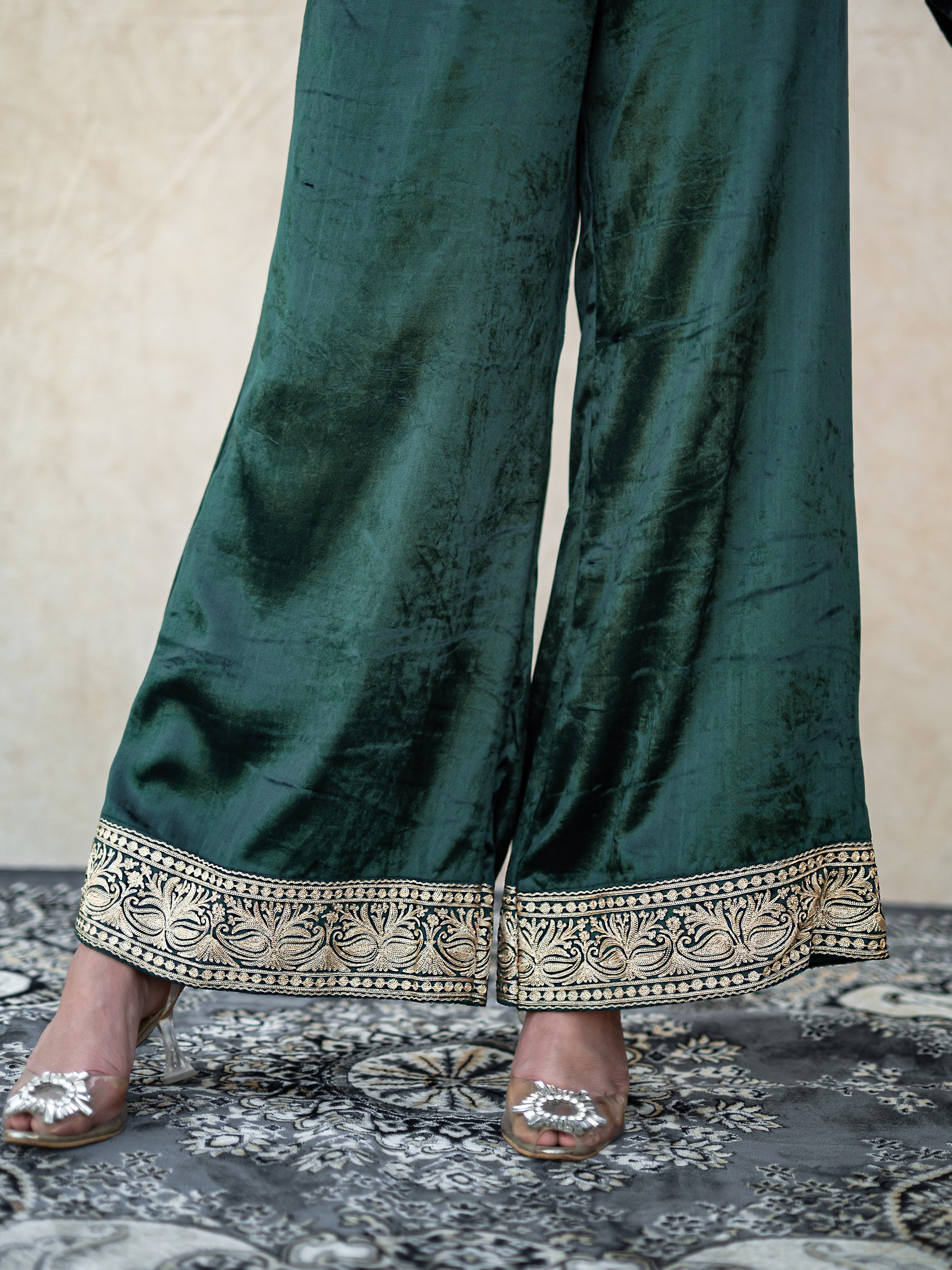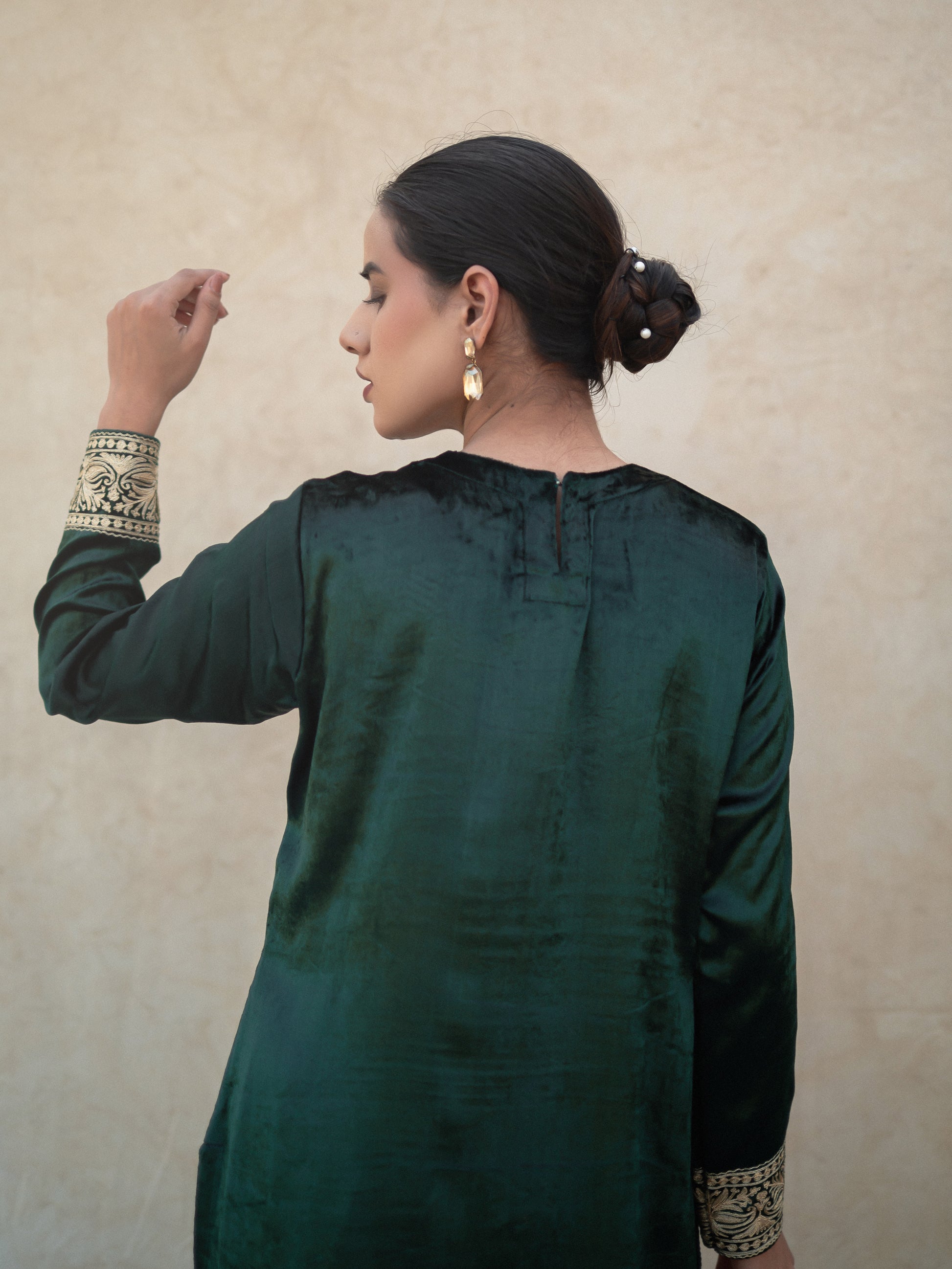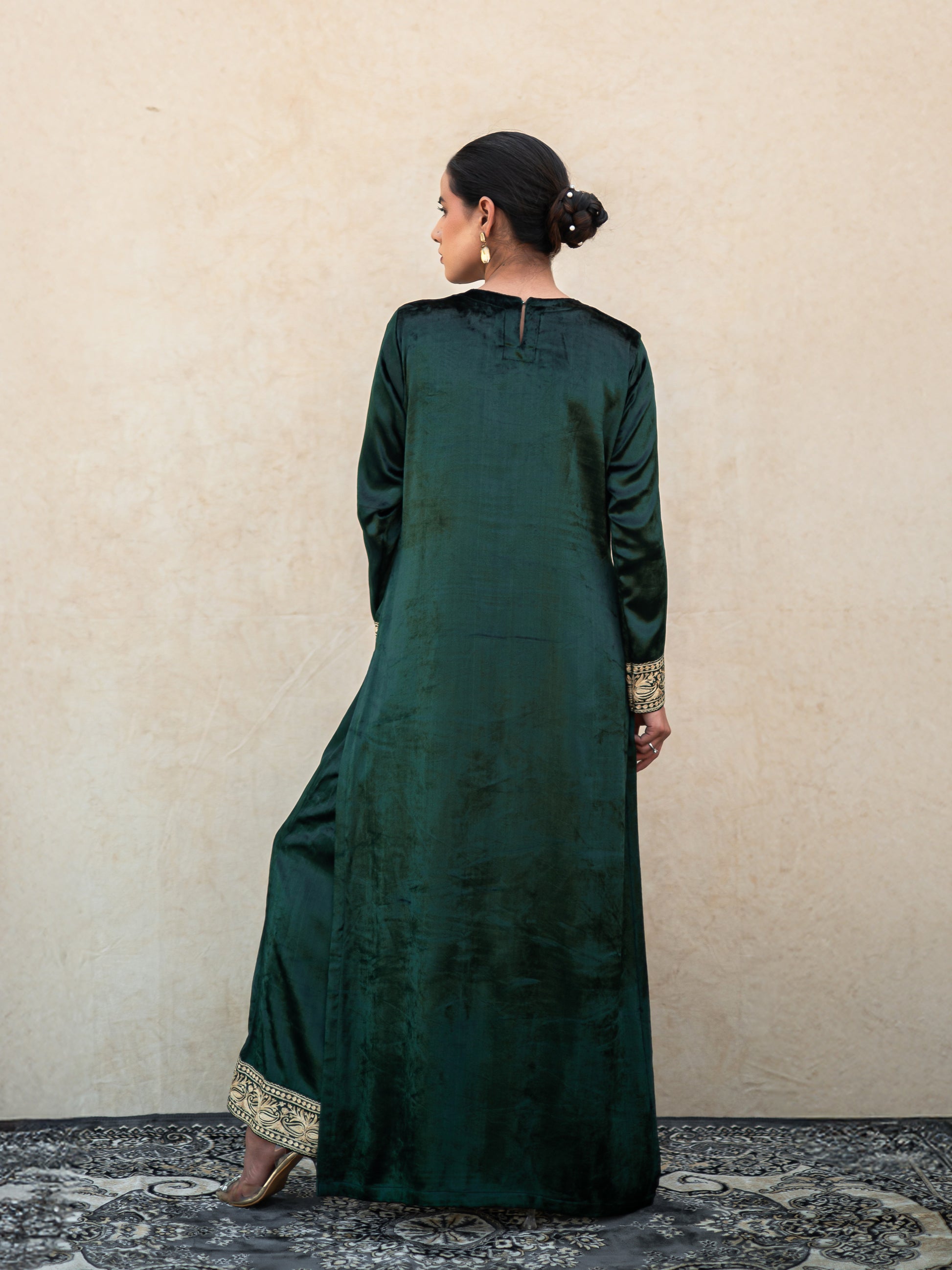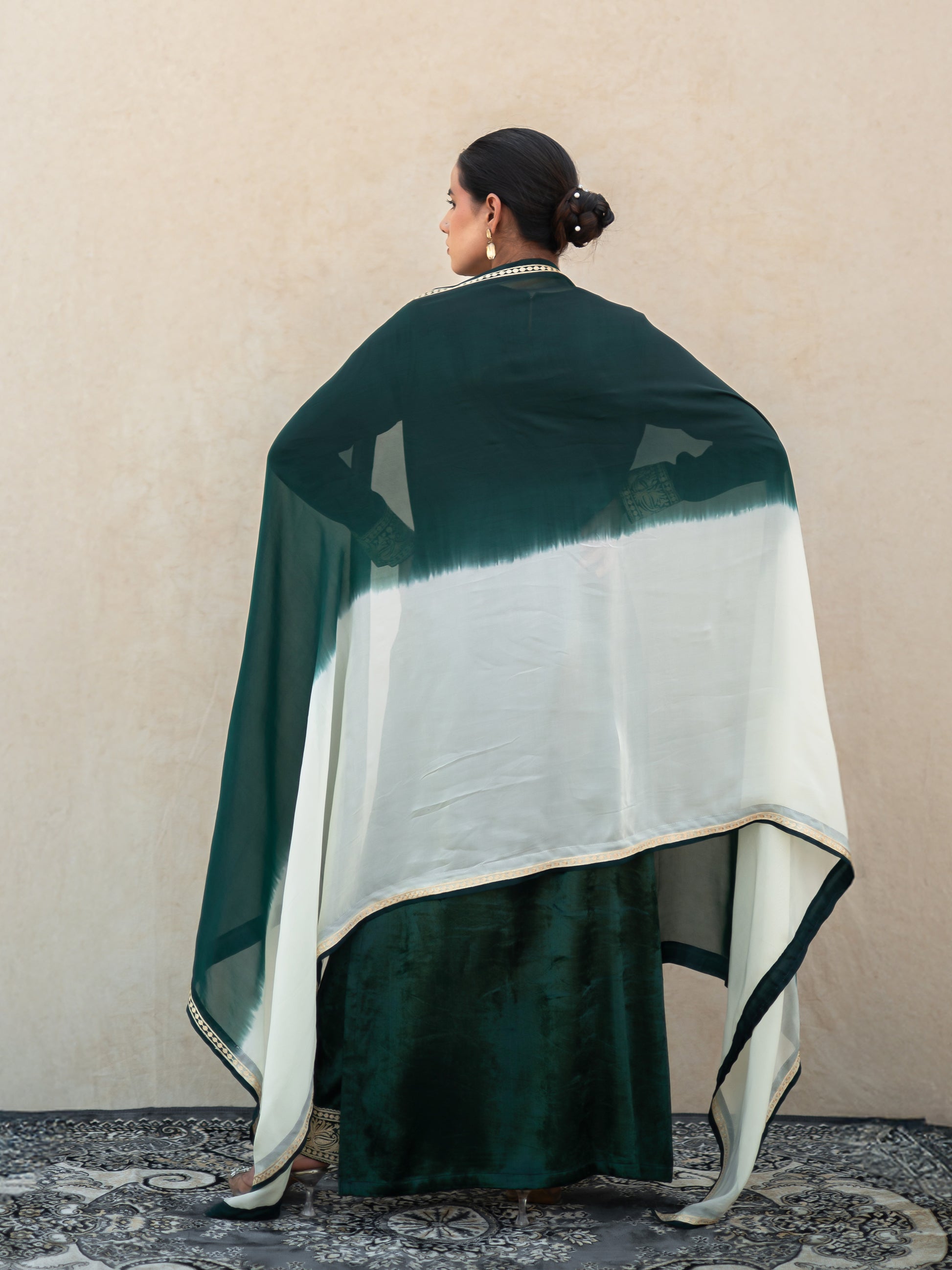 Make an unforgettable statement with the Zoon green suit set. This stunning three-piece collection features a green velvet long kurta adorned with intricate "Kashmiri Golden Tilla" embroidery that captures light and admiration in equal measure. The harmoniously coordinated velvet straight pants deliver a polished, contemporary silhouette that flatters effortlessly. Accessorize with the delicate green and off-white organza dupatta to unlock versatile styling possibilities.