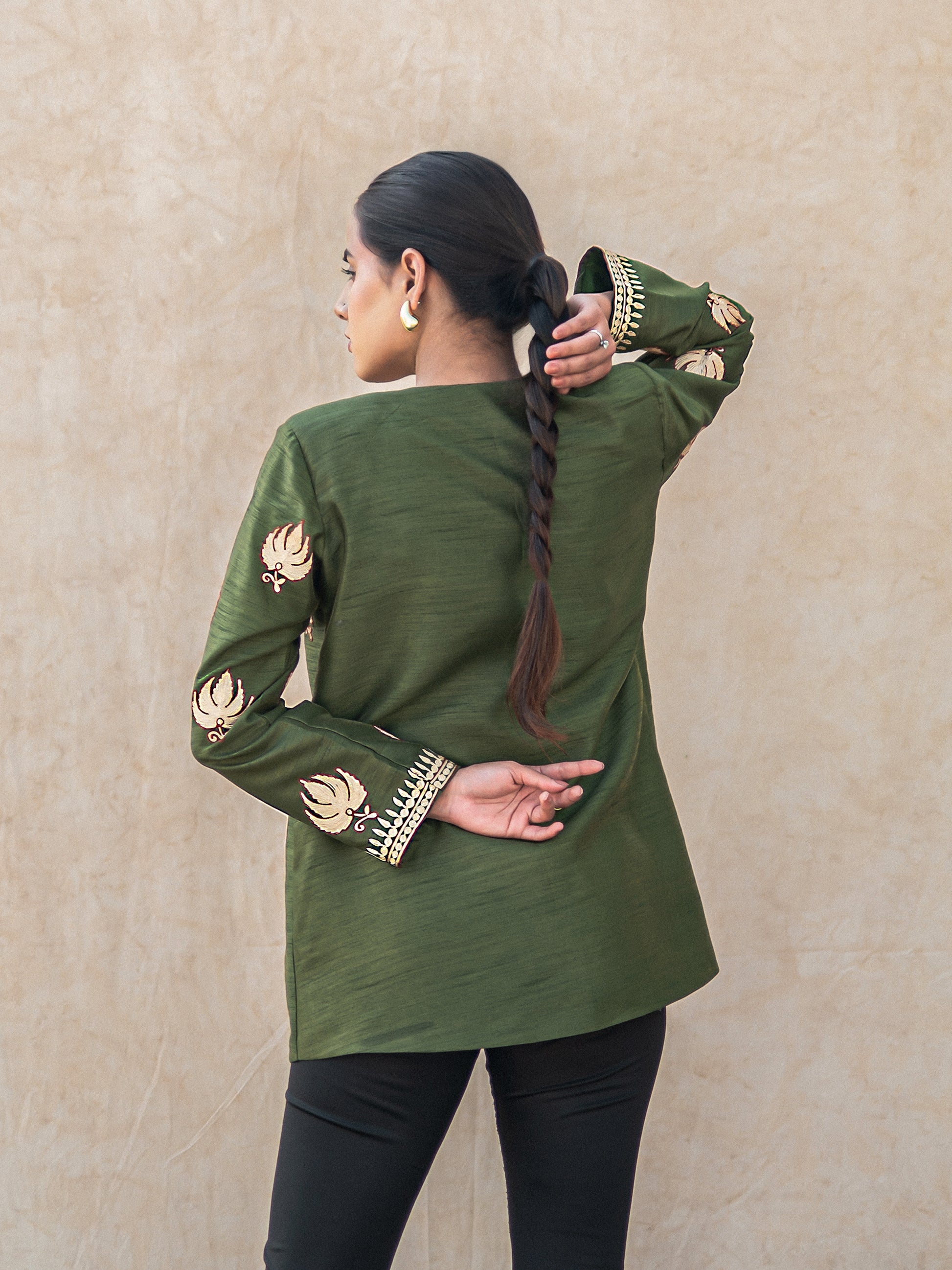 Make a lasting impression with the Zoon mehandi green jacket, where traditional artistry meets modern elegance. Crafted from silk in a flattering mehandi green, this jacket features "Kashmiri Golden Tilla" embroidery paired with rich rust aari detailing that adds depth and character.