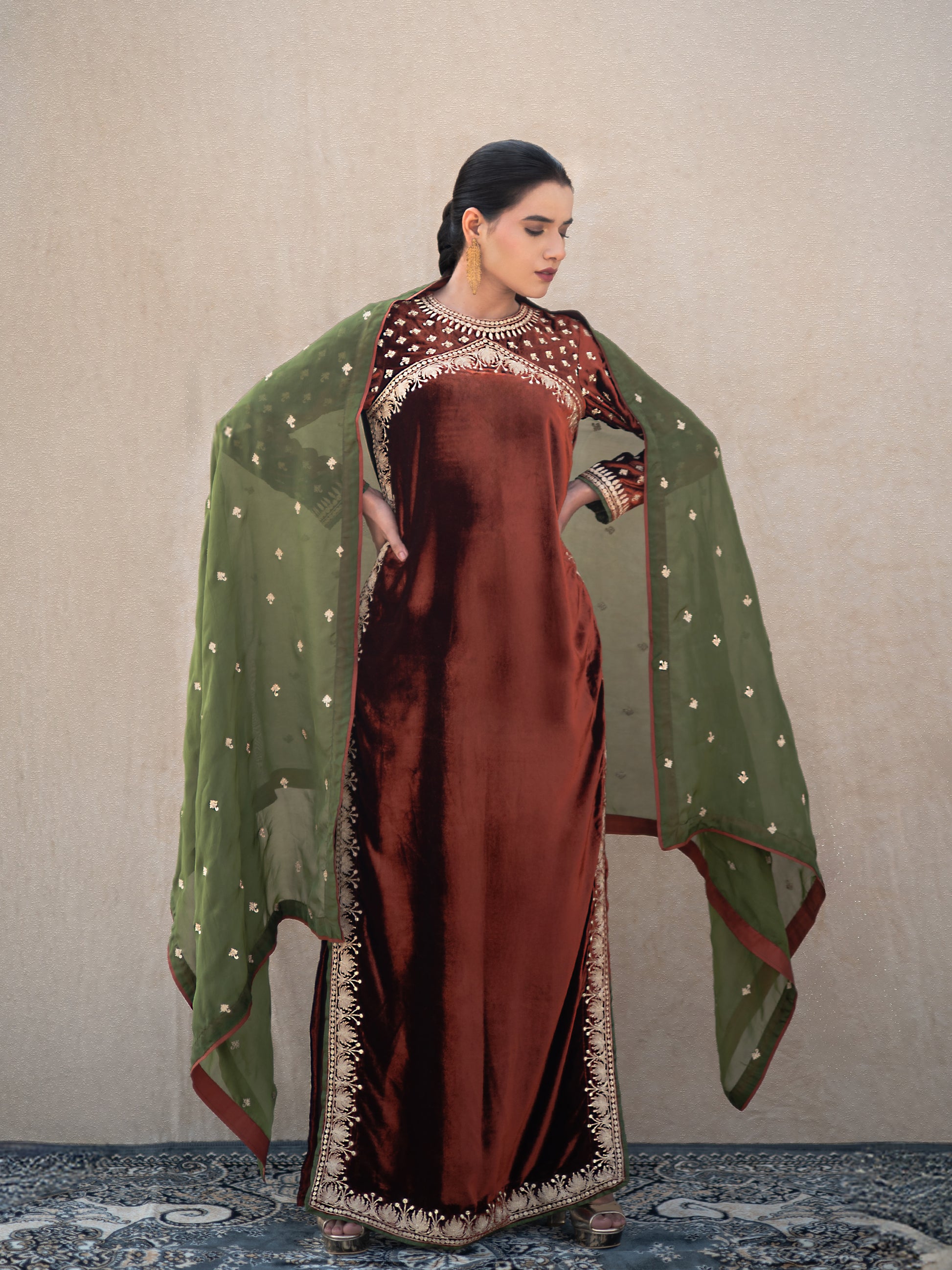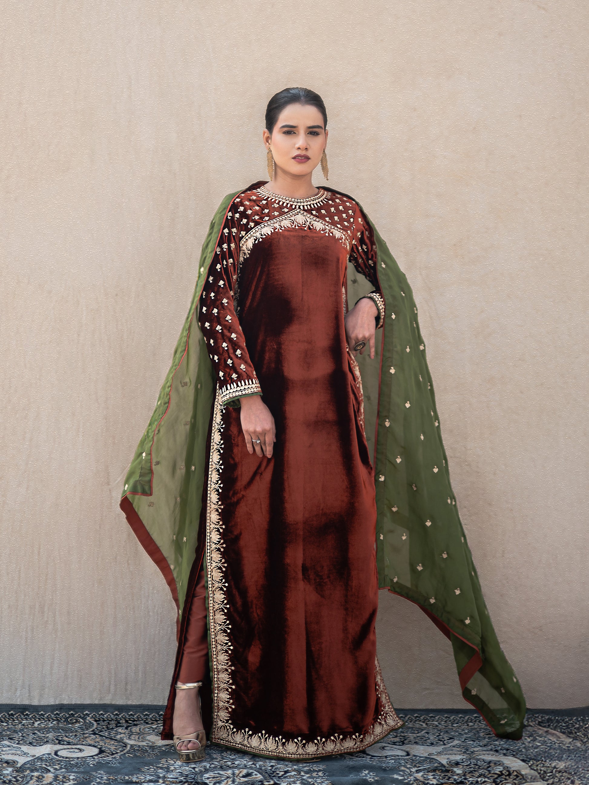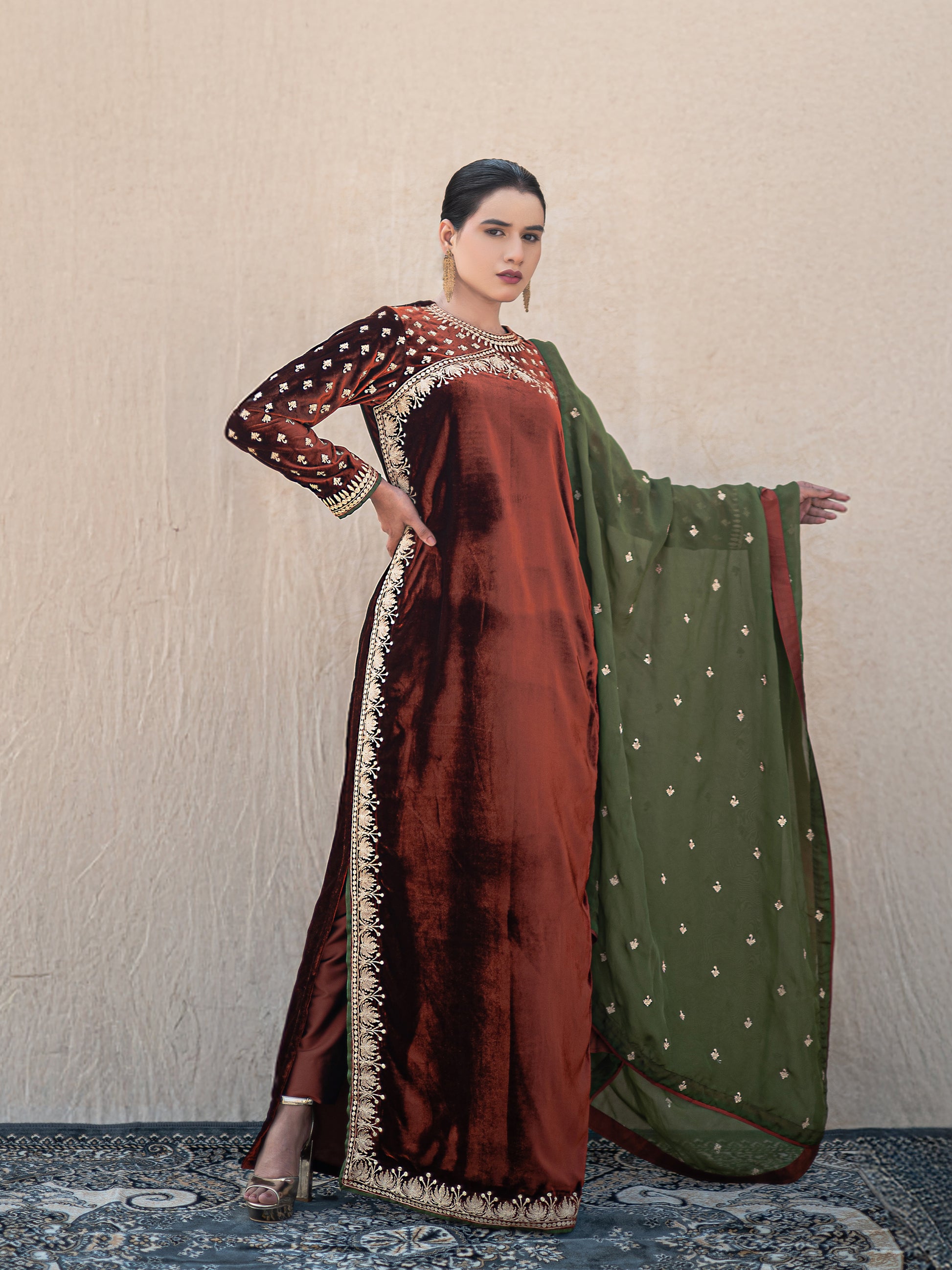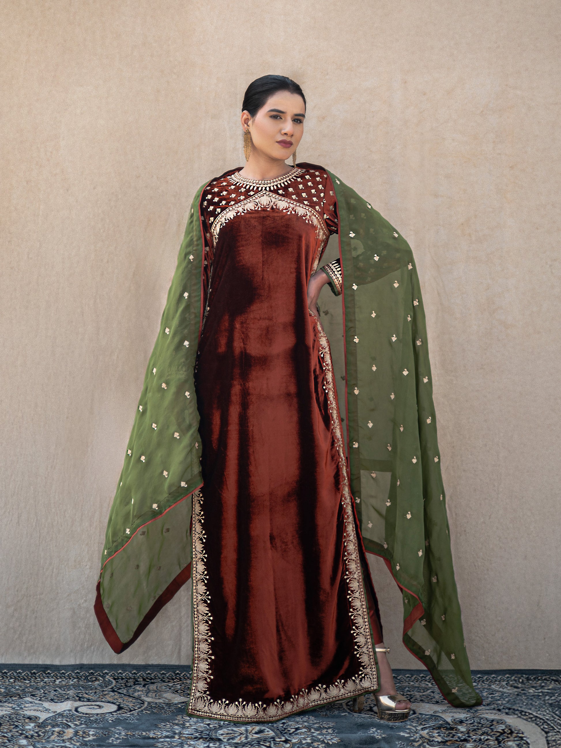 Make a statement with the Zoon rust & green suit set, where timeless artistry meets modern sophistication. This exquisite three-piece ensemble features a sumptuous rust velvet long kurta adorned with intricate "Kashmiri Golden Tilla" embroidery that catches light beautifully. The coordinating rust silk straight pants provide a comfortable yet polished foundation, while the vibrant green organza dupatta adds an unexpected pop of color and movement.