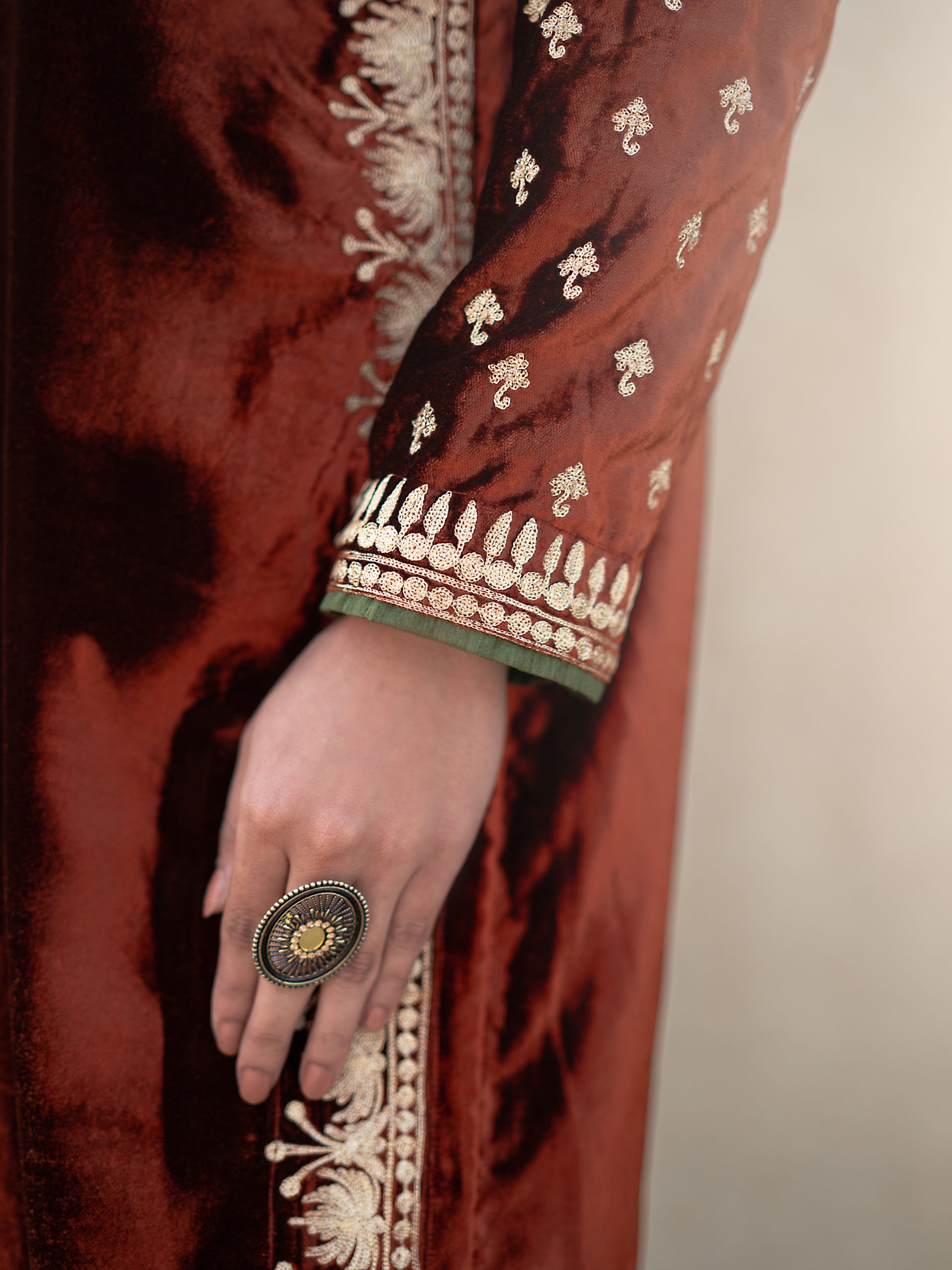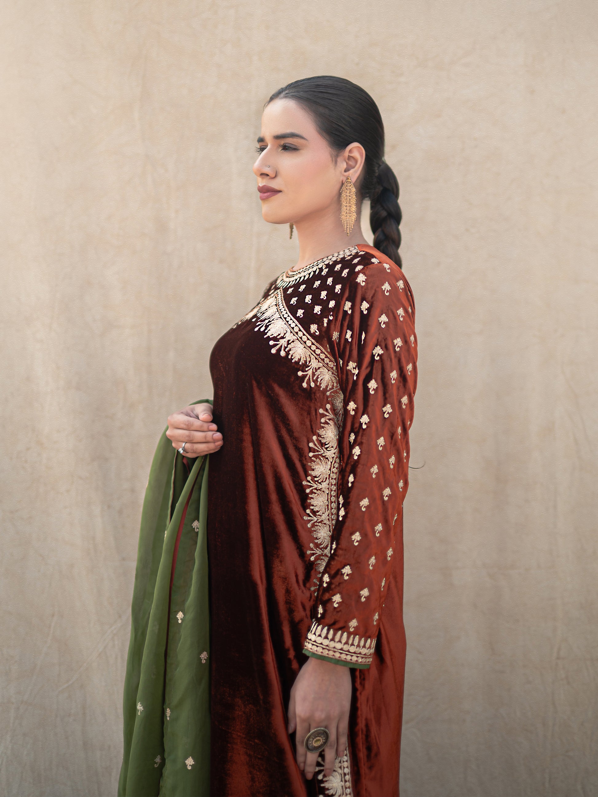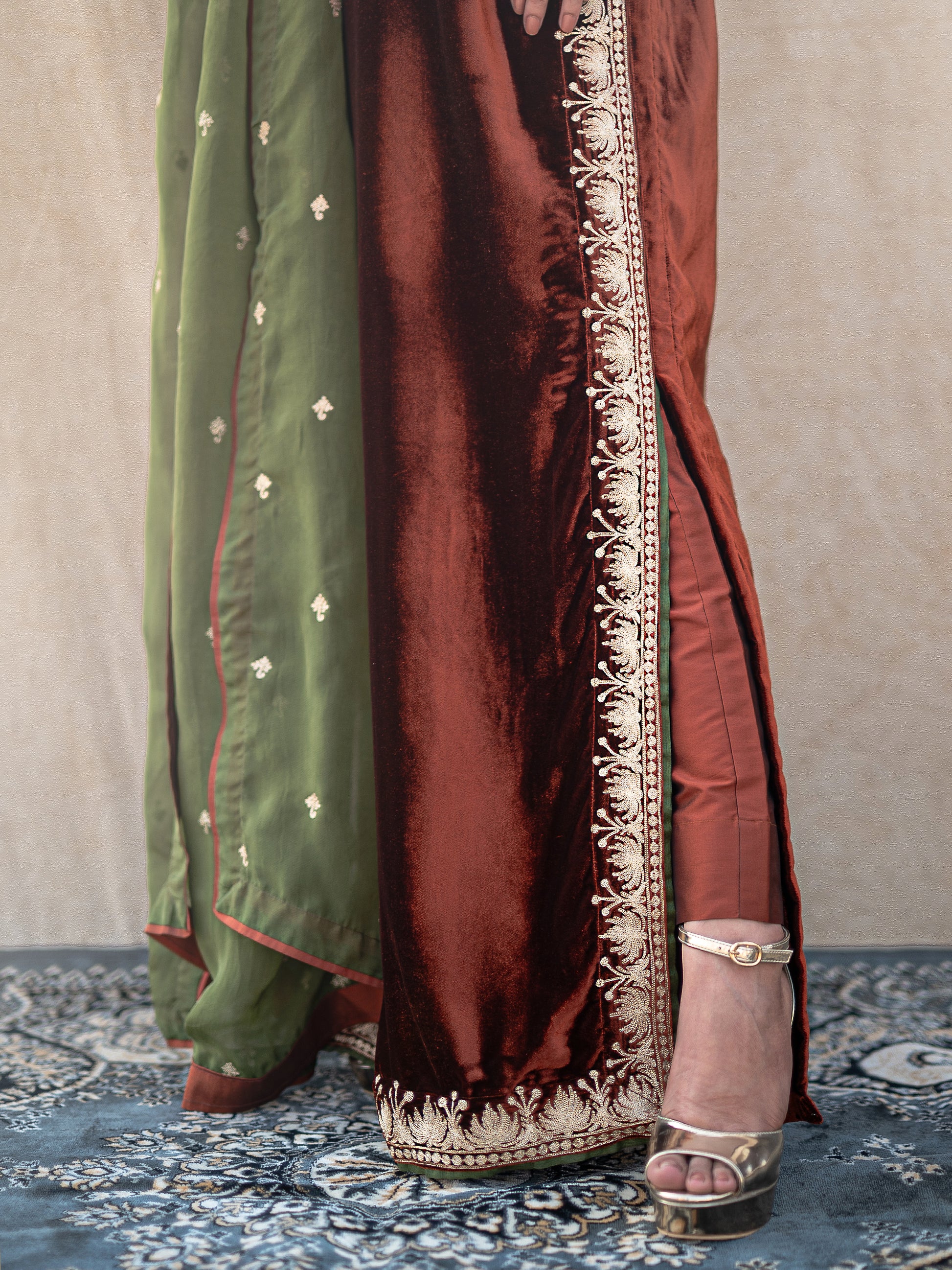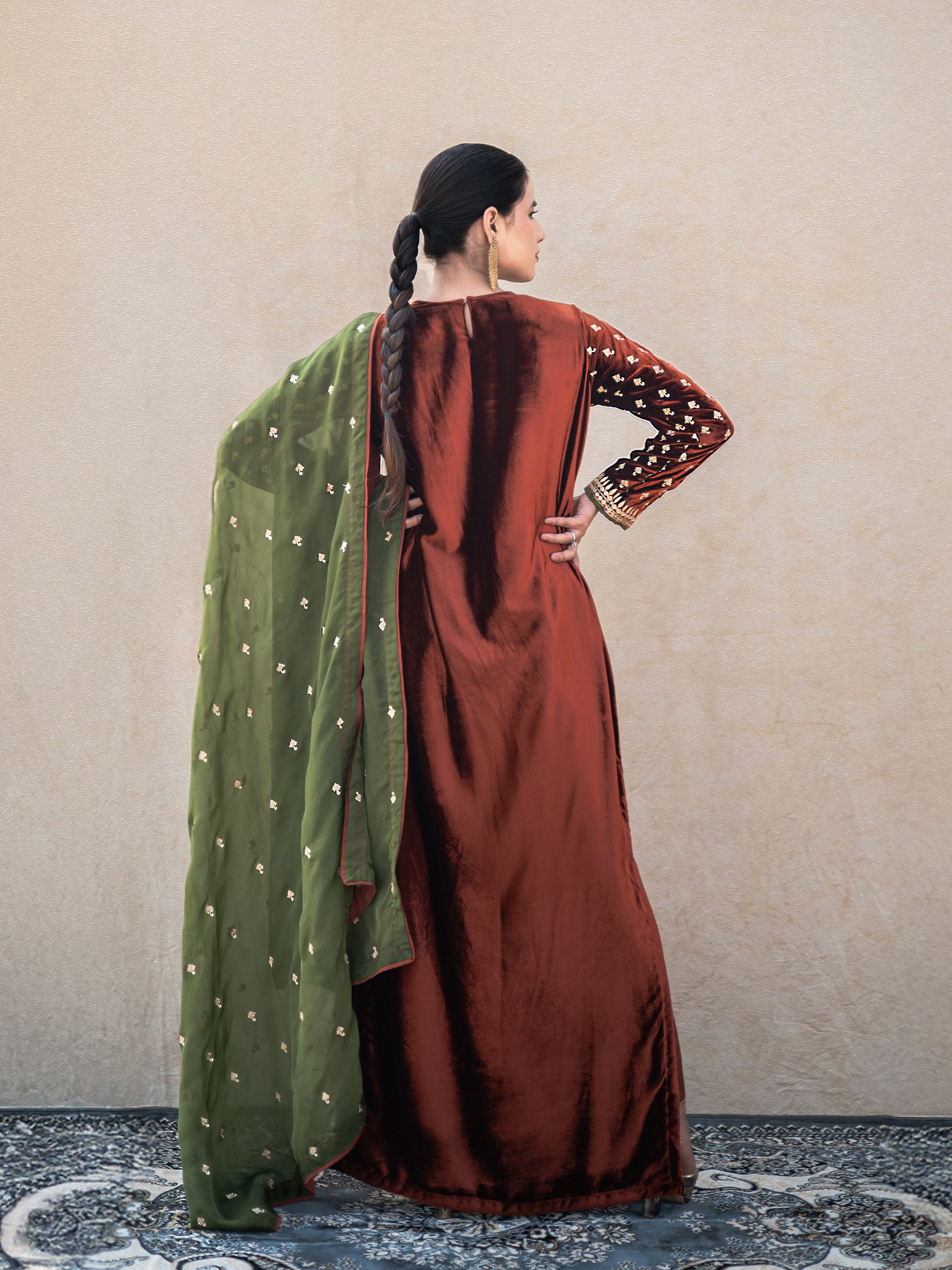 Make a statement with the Zoon rust & green suit set, where timeless artistry meets modern sophistication. This exquisite three-piece ensemble features a sumptuous rust velvet long kurta adorned with intricate "Kashmiri Golden Tilla" embroidery that catches light beautifully. The coordinating rust silk straight pants provide a comfortable yet polished foundation, while the vibrant green organza dupatta adds an unexpected pop of color and movement.