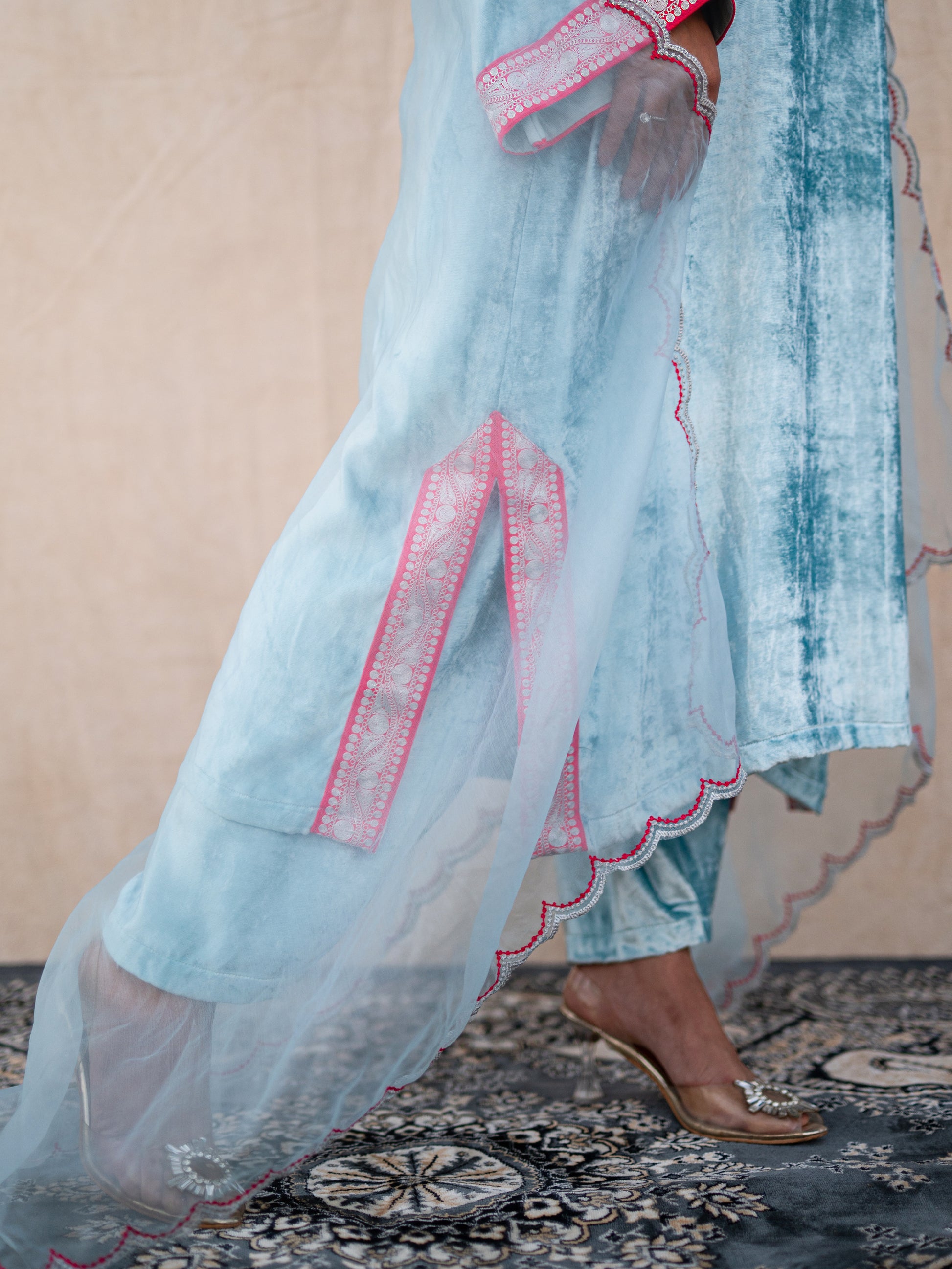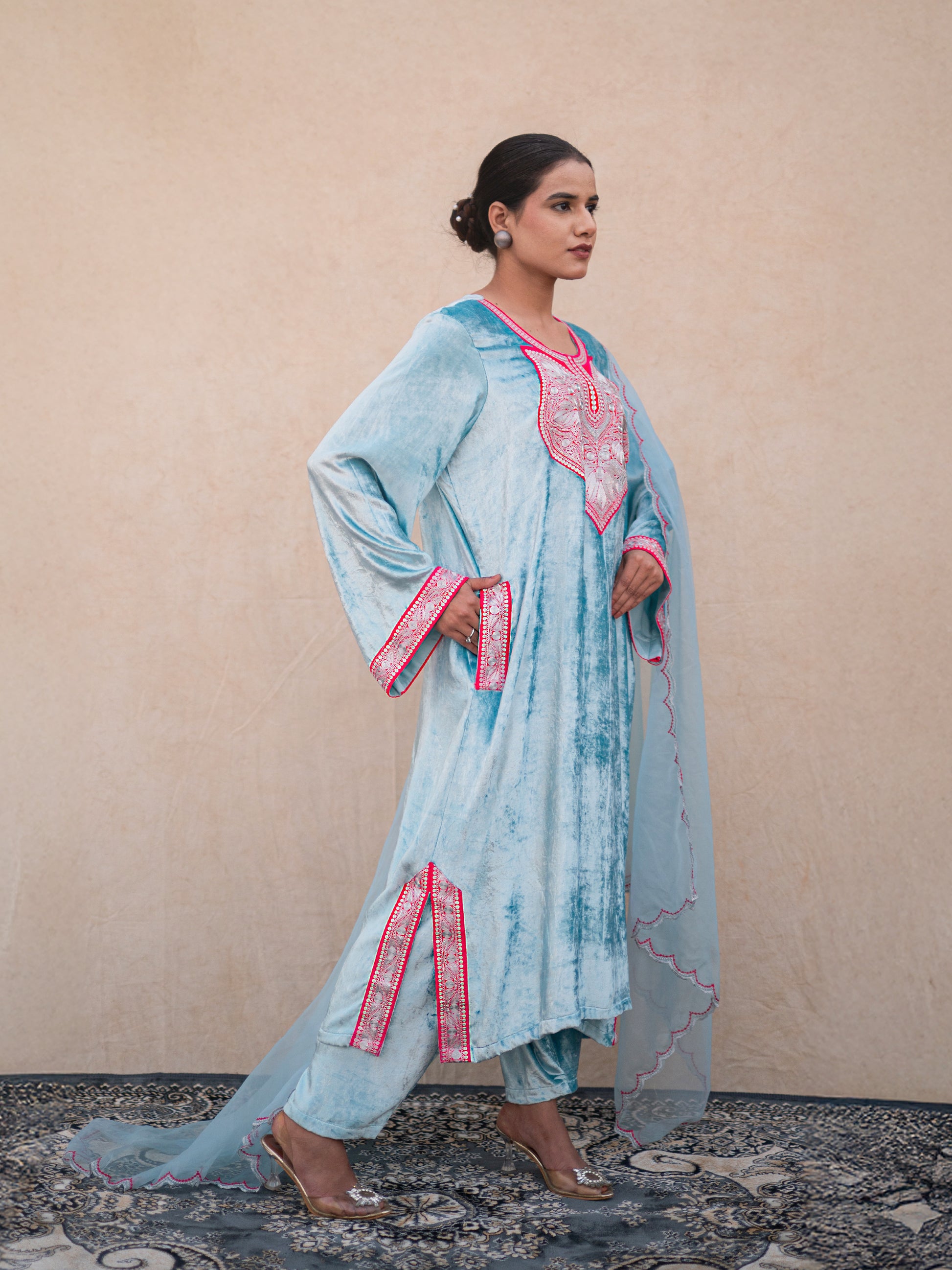 Discover the allure of timeless elegance with the Zoon sky blue pheran set. Crafted from sumptuous sky blue velvet, the kurta showcases authentic "Kashmiri Silver Tilla" embroidery that catches light beautifully, while the matching straight salwar creates a flattering, graceful drape. The crowning jewel is the sky blue organza dupatta, delicately finished with pink and silver scalloped embroidery that adds a sophisticated pop of color.